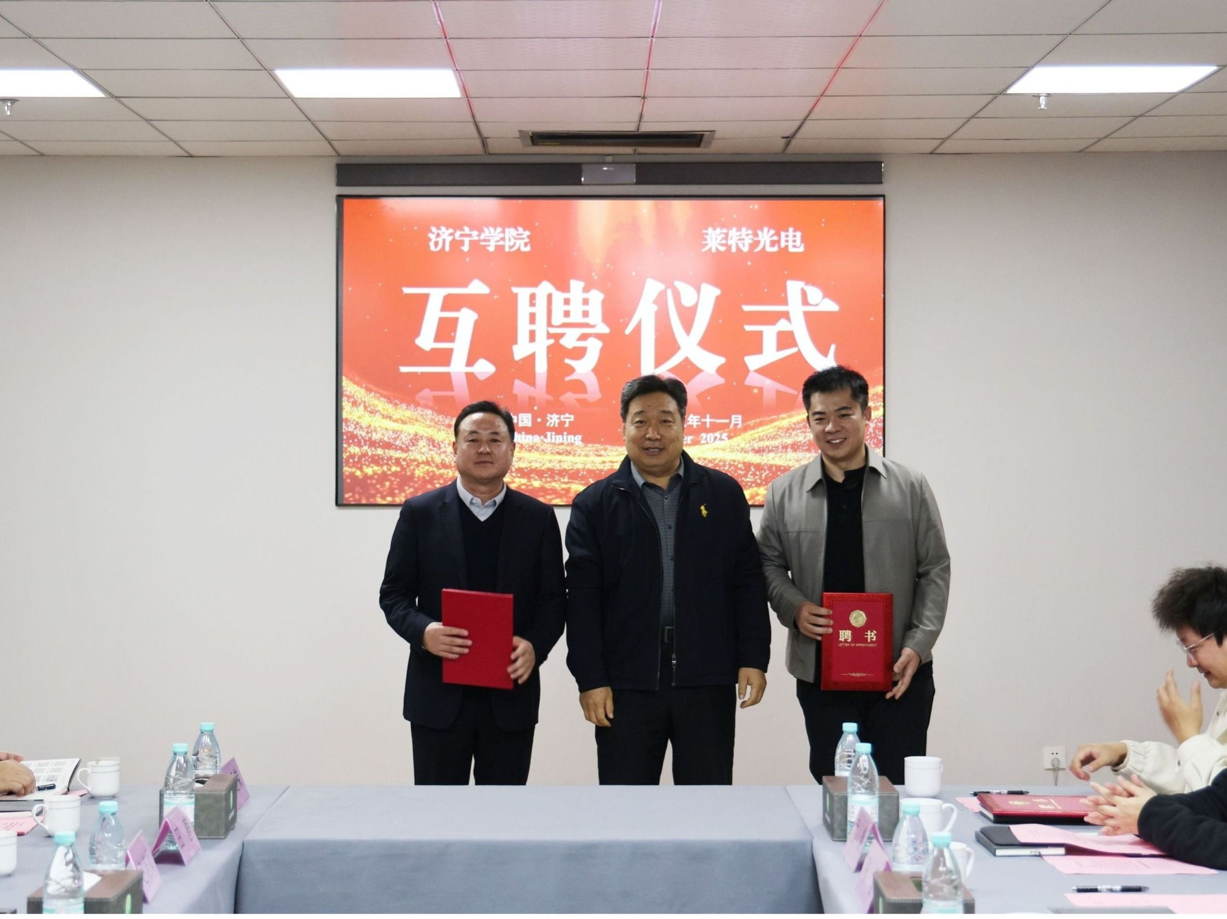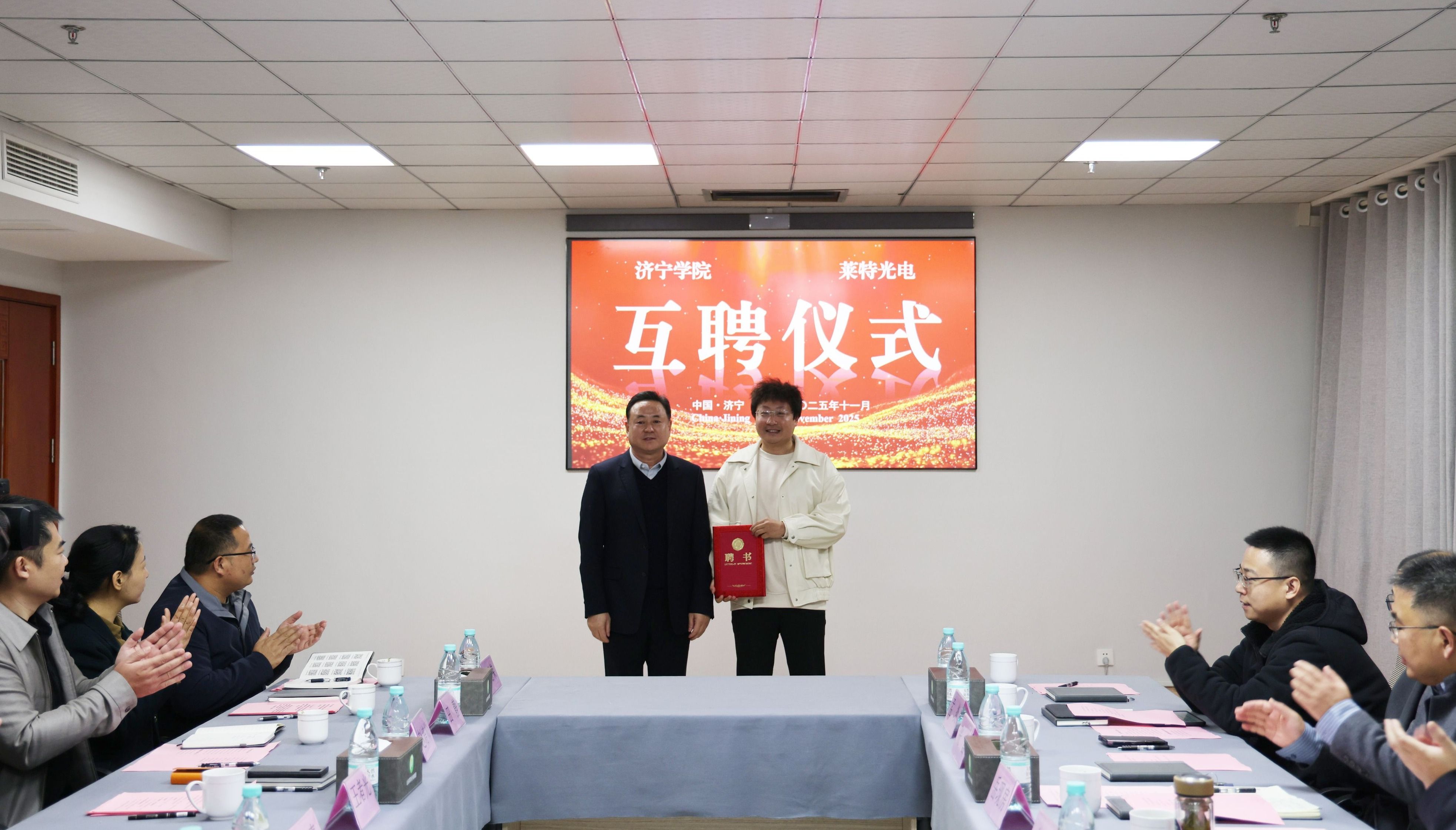 在人才互聘环节,王清明为王者光、赵培帅颁发“亚星在线登录官网客座教授”聘书,邀请企业家走进校园参与课程教学、毕业设计指导。