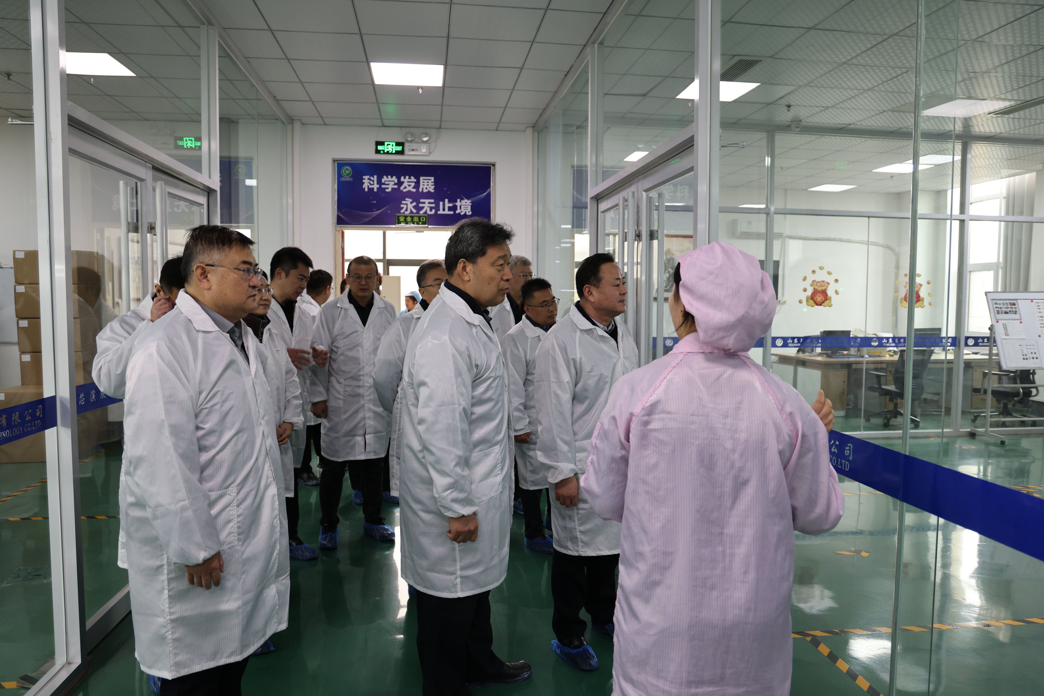 王清明一行实地考察了山东莱特光电集团展厅、LED照明、充电桩、芯片等生产装配车间,听取了关于公司发展历程、产品研发、销售和技术需求等方面的情况介绍。