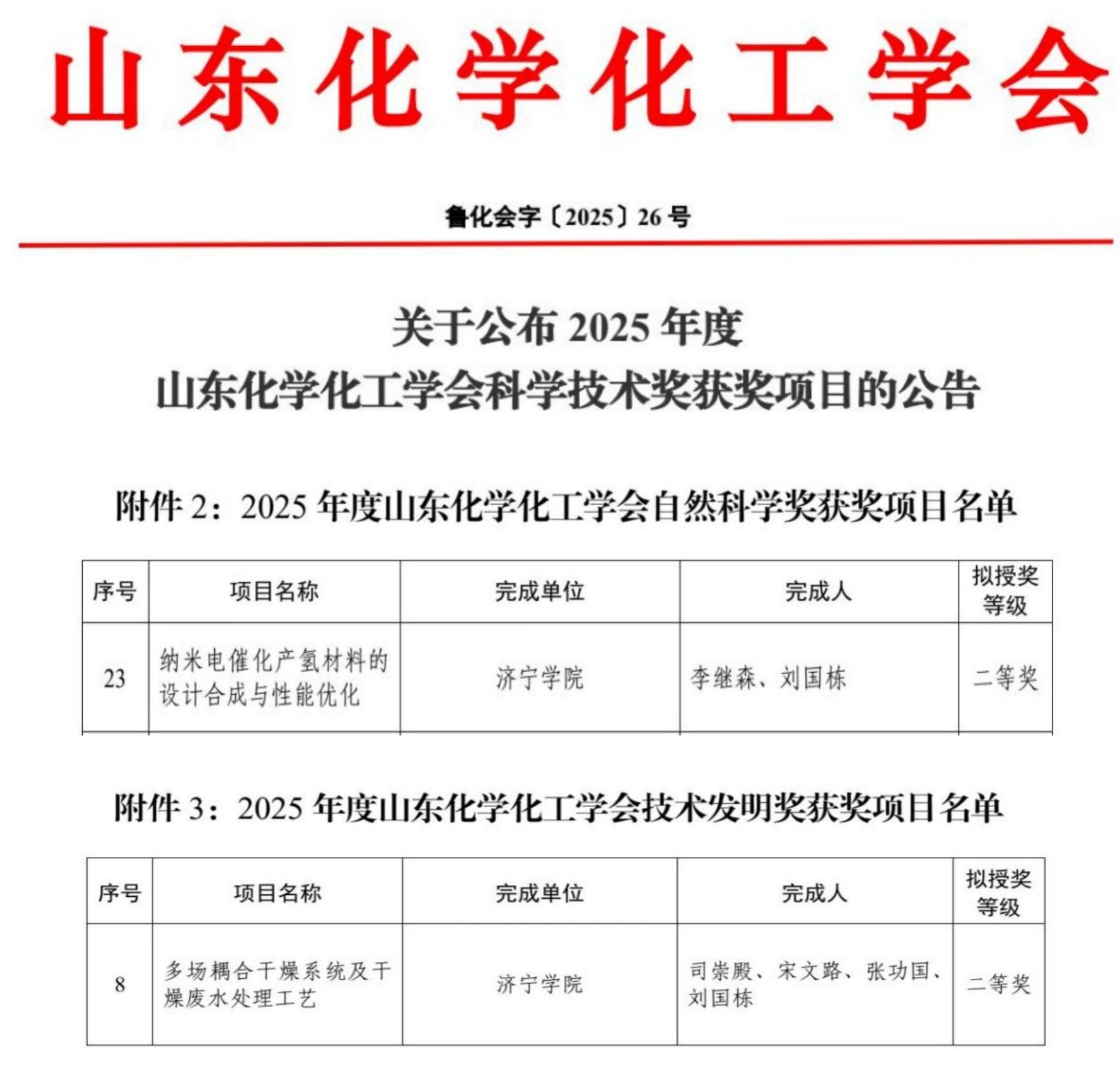 近日,2025年度山东化学化工学会科学技术奖评选结果揭晓,我校化学化工与材料学院凭借在基础研究与应用开发方面的突出贡献,获评自然科学奖与技术发明奖各一项,实现高质量科研成果的双丰收,彰显了我校在化学化工学科领域的深厚积淀与强劲实力。