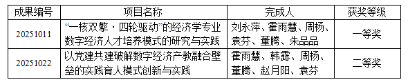 近日,山东省数字经济学会正式公示2025年度党建与优秀教学成果评选结果。经单位申报、学会审查、专家多轮评审,我校经济管理学院申报的两项教学成果《“一核双擎·四轮驱动”的经济学专业数字经济人才培养模式的研究与实践》和《以党建共建破解数字经济产教融合壁垒的实践育人模式创新与实践》分别荣获一等奖和二等奖,彰显了经济管理学院在数字经济教育教学改革与党建引领育人方面的扎实探索与创新成效。