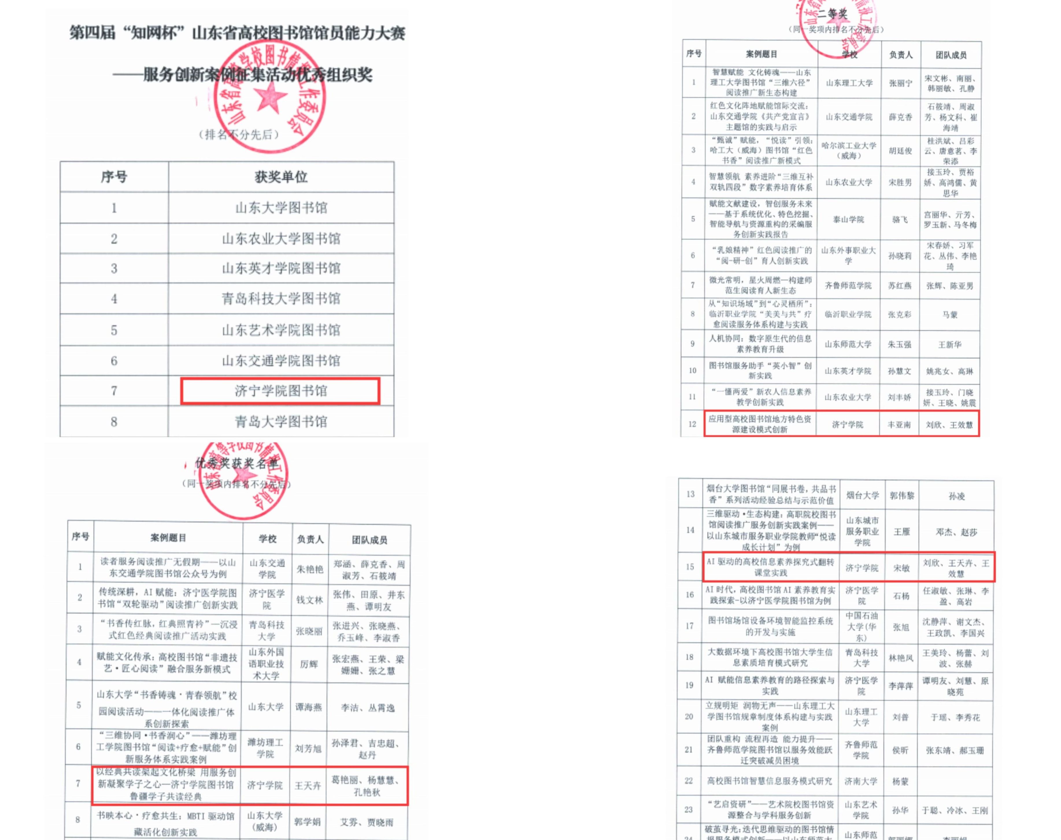 近日,由山东省高校图工委等单位联合主办的第四届“知网杯”山东省高校图书馆馆员能力大赛服务创新案例征集活动圆满结束。我校图书馆荣获二等奖一项,优秀奖两项,并获优秀组织奖。