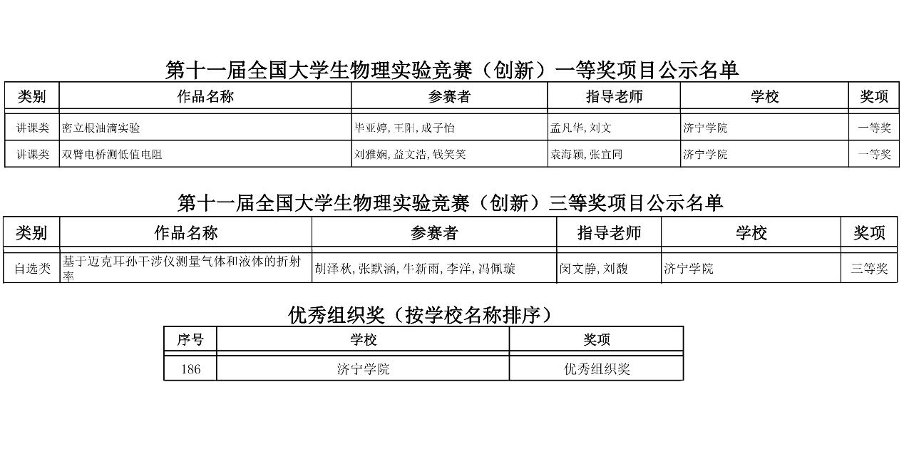 11月21日至23日,第十一届全国大学生物理实验竞赛(创新)决赛在中南大学举行,通过校赛、省赛选拔,来自全国331所高校的750支队伍最终从3260支预赛队伍中脱颖而出。我校物理与电子工程学院参加讲课类决赛的2支队伍(每校限额不超过2支队伍)全部获得一等奖,实现连续两年参赛队伍全部获得一等奖。参加自选类决赛的1支队伍获得三等奖,也是我校首次在该赛事实物类赛道获得国奖。同时学校还被授予优秀组织奖。
