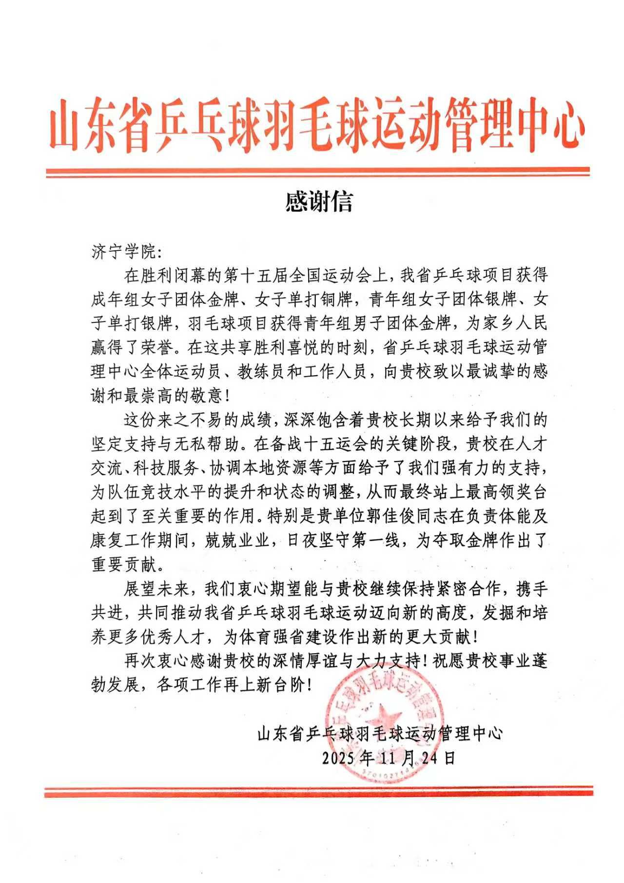 近日,山东省乒乓球羽毛球运动管理中心向我校发来感谢信,对我校在第十五届全国运动会备战期间给予的支持与帮助表示诚挚感谢,高度肯定了我校学生在体能及康复工作中的突出贡献。