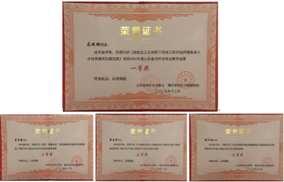 12月5日至7日,2025年度山东省对外经济学会年会暨山东省建设更高水平开放型经济新体制战略论坛在潍坊隆重召开。本次论坛由山东省对外经济学会主办,潍坊学院承办。我校外国语学院教师马晓丽、桑春芳代表跨境电商团队应邀参会,并荣获教学成果一等奖1项,三等奖3项。