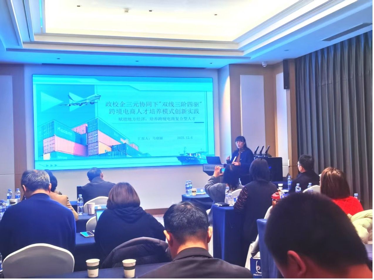 在“学科发展与教学成果研讨”分论坛上,马晓丽受邀就其教学成果《政校企三元协同下"双线三阶四驱"跨境电商人才培养模式创新实践》作了现场报告与分享,详细介绍了我校跨境电商人才培养模式的实施过程、创新点及取得的成效,赢得了与会专家的一致认可。