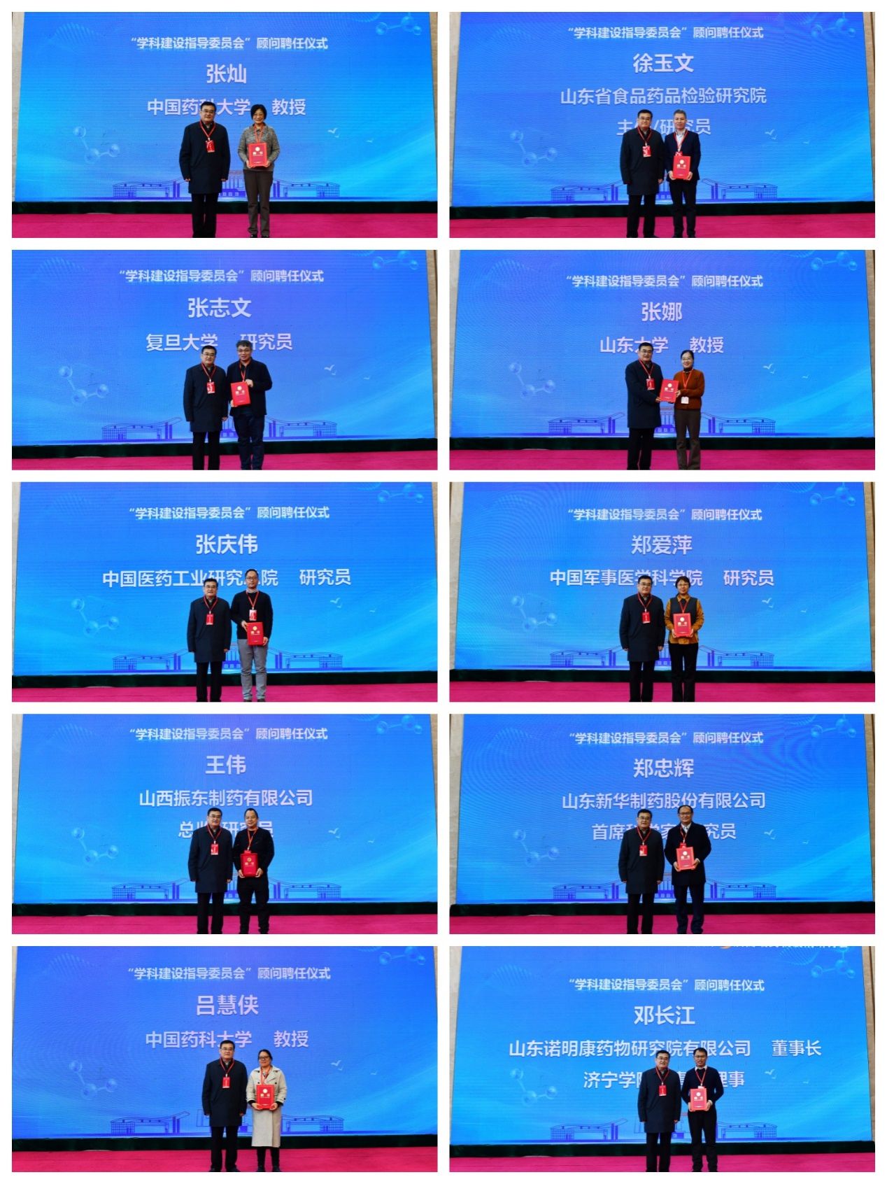 本次活动,丰家雷为中国药科大学教授张灿、山东省食品药品检验研究院研究员徐玉文、复旦大学研究员张志文、山东大学教授张娜、中国医药工业研究总院研究员张庆伟、中国军事医学科学院研究员郑爱萍、山西振东制药有限公司总监王伟、山东新华制药股份有限公司首席科学家郑忠辉、中国药科大学教授吕慧侠、山东诺明康药物研究院有限公司董事长邓长江等颁发“生物与医药学科建设指导委员会”顾问聘书。