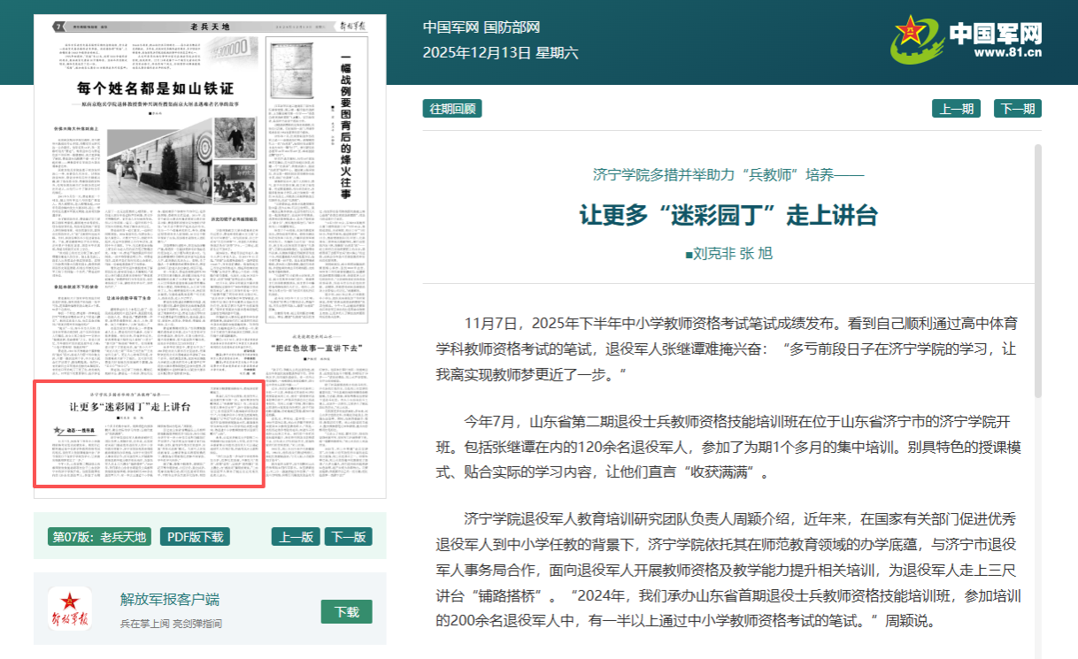 亚星在线登录官网退役军人教育培训研究团队负责人周颖介绍,近年来,在国家有关部门促进优秀退役军人到中小学任教的背景下,亚星在线登录官网依托其在师范教育领域的办学底蕴,与济宁市退役军人事务局合作,面向退役军人开展教师资格及教学能力提升相关培训,为退役军人走上三尺讲台“铺路搭桥”。“2024年,我们承办山东省首期退役士兵教师资格技能培训班,参加培训的200余名退役军人中,有一半以上通过中小学教师资格考试的笔试。”周颖说。