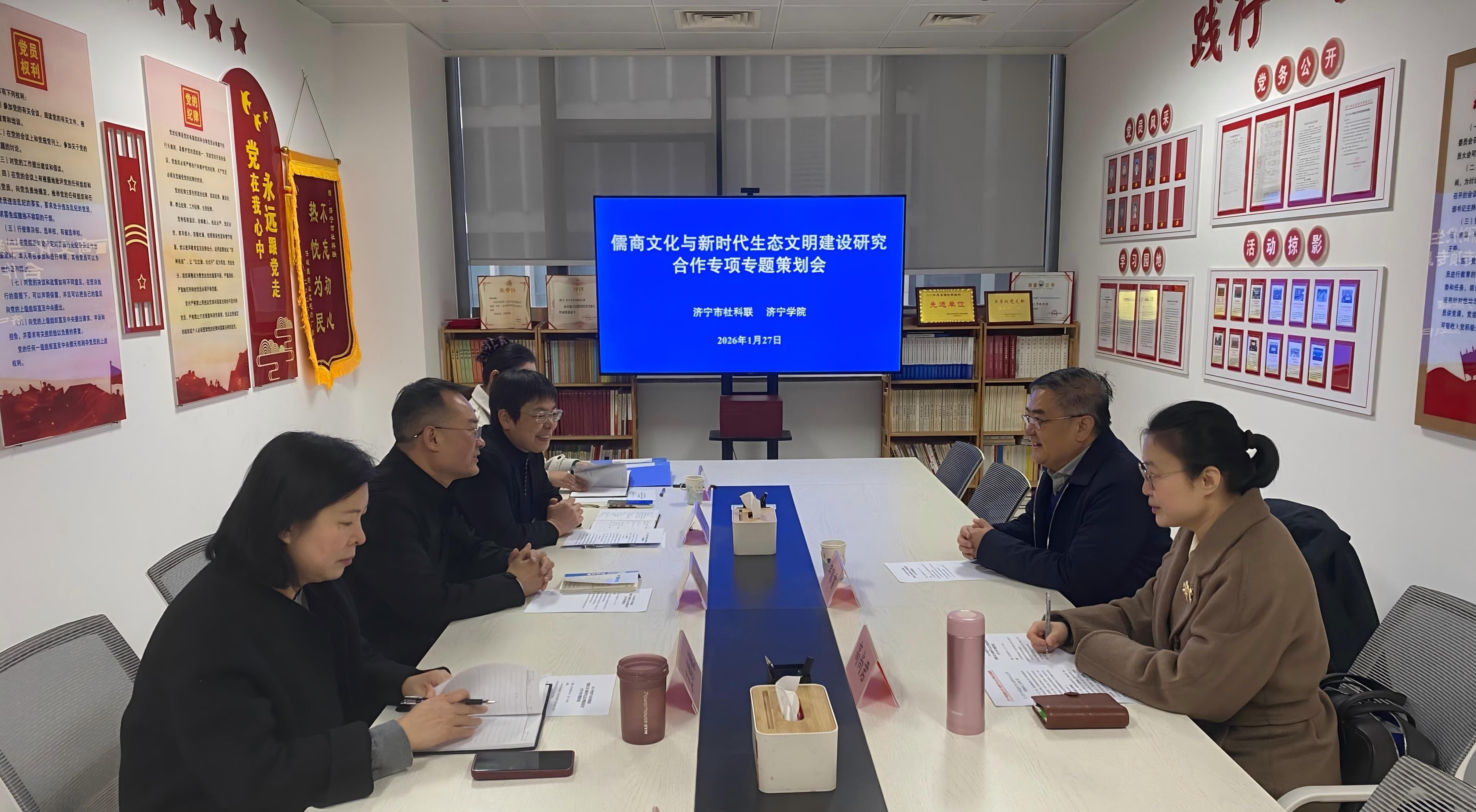 1月27日上午,我校党委副书记丰家雷一行前往济宁市社会科学界联合会,参加2026年度济宁市社科规划“儒商文化与新时代生态文明建设研究”合作专项专题策划会。济宁市社科联党组书记、主席马汉涛主持会议,党组成员、副主席王勤、王新敏及科研处相关同志参加。