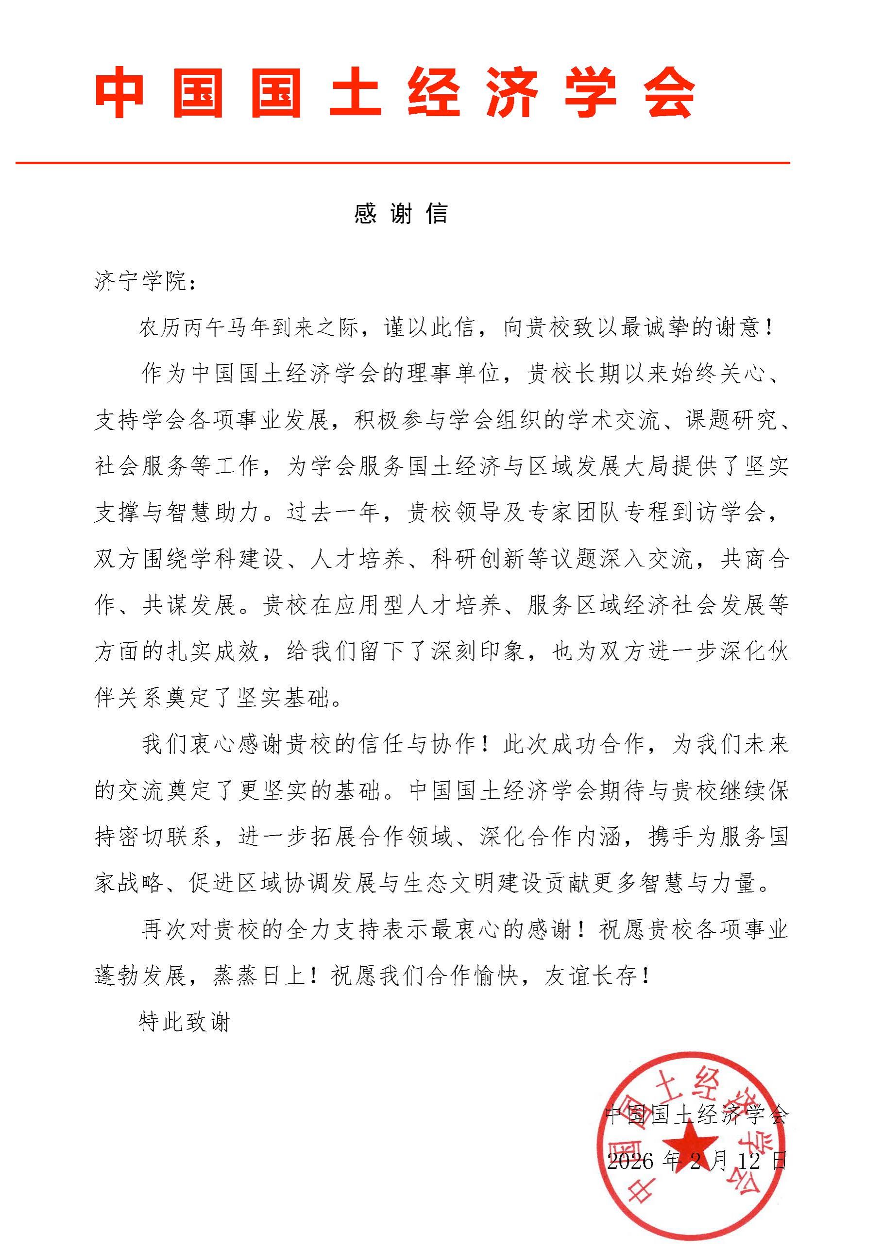 2月13日,学校收到中国国土经济学会的一封感谢信,对我校支持学会各项事业发展,积极参与学会组织的学术交流、课题研究、社会服务等工作表示感谢。