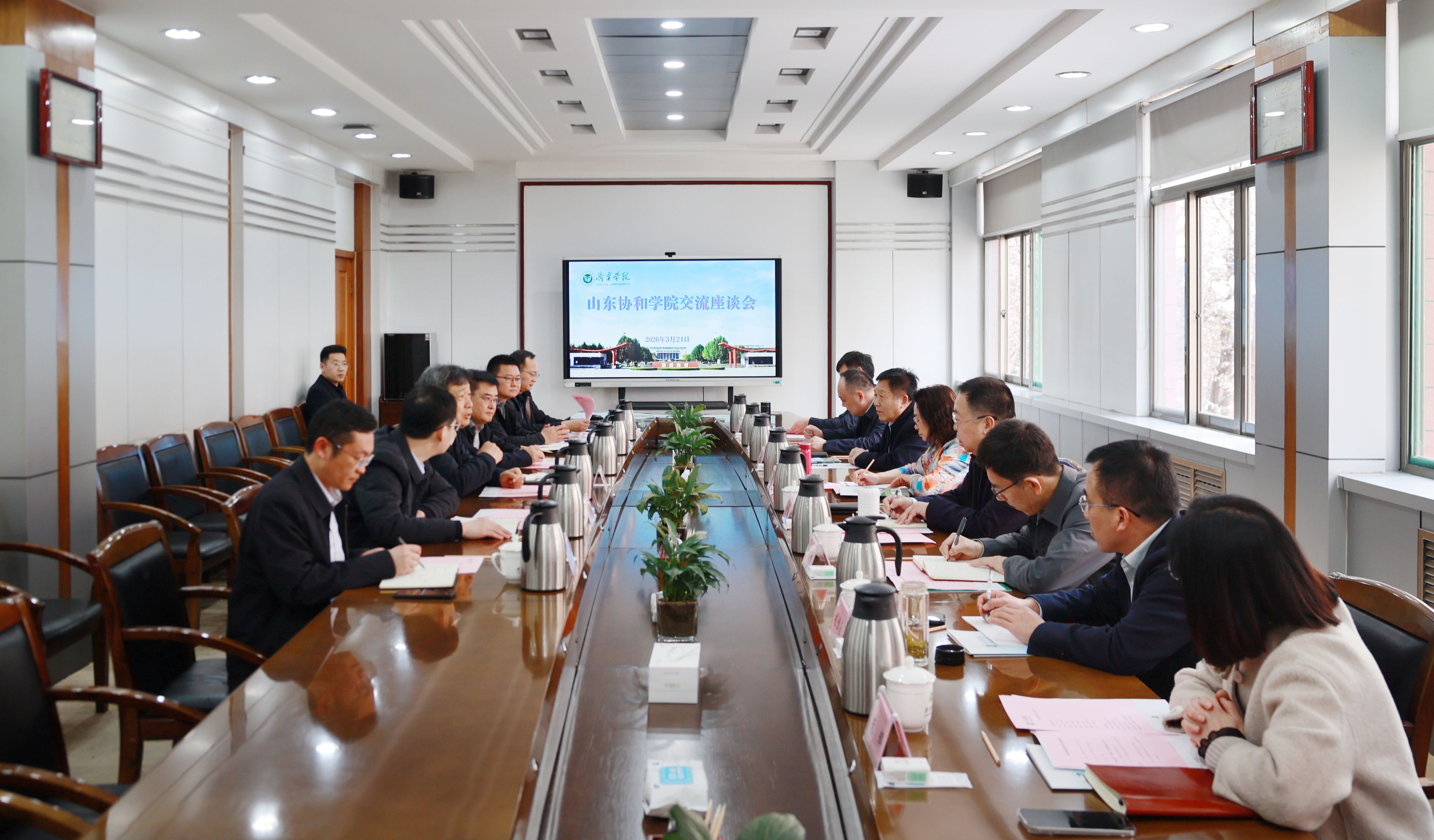 3月24日,山东协和学院创办人王桂云、党委书记刘宗明、校长周传安带队来我校调研学科建设、教学科研、师资队伍建设、人才培养、中外合作办学项目申报等方面的情况。党委副书记、校长王清明,党委副书记丰家雷,党委委员、副校长赵明,副校长刘国栋,党委委员、宣传部(教师工作部)刘克非出席座谈会。