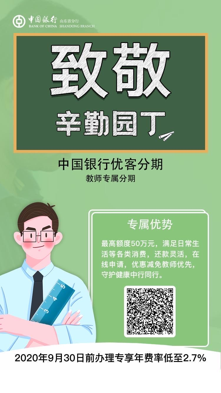 教师节来临,中国银行为了感恩回馈辛勤园丁,致力于向广大教师提供优质金融服务,满足您的各类消费资金需求,特推出优客分期(信用类贷款),年费率低至2.7%,最高额度50万,联系电话:曲阜中行 毕主任15563114321,孔行长13562786461