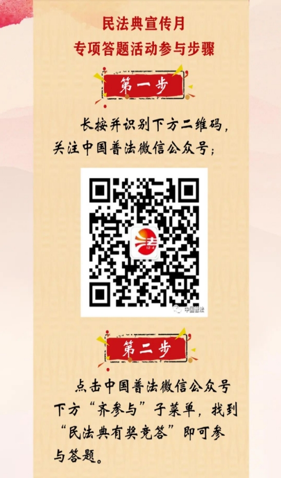 今年5月28日是《中华人民共和国民法典》颁布两周年,为深入学习贯彻习近平总书记关于加强民法典学习宣传的重要指示精神,让每位师生走进、了解、运用民法典,中国普法微信公众号于5月举办“民法典宣传月专项答题”活动,根据中共济宁市委全面依法治市委员会守法普法协调小组《关于组织开展民法典宣传月专项答题活动的通知》要求,现将有关事项通知如下。