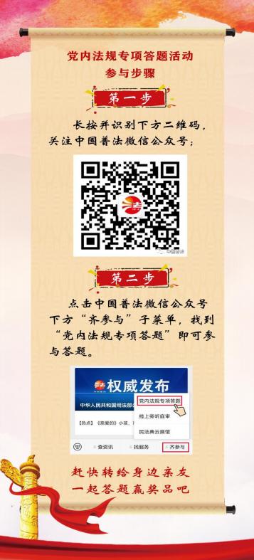 为庆祝中国共产党成立101周年,中国普法微信公众号于7月1日至30日,举办为期30天的党内法规专项答题活动,根据中共济宁市委全面依法治市委员会守法普法协调小组《关于组织开展党内法规专项答题活动的通知》要求,现将有关事项通知如下。