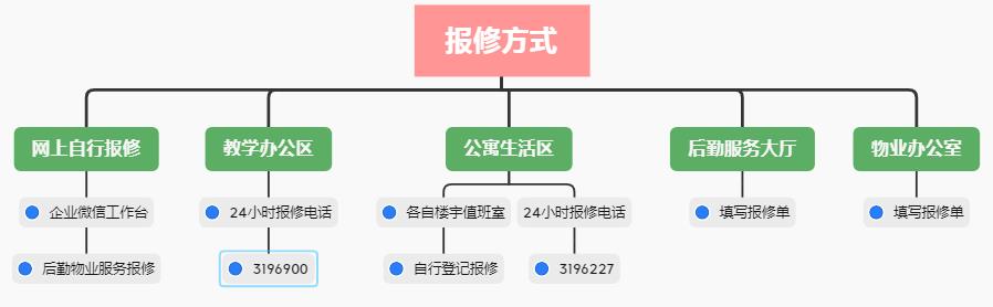 2、报修方式:教学办公区的维修可以申请网络报修、拨打24小时报修电话3196900、物业办公室填写报修单;生活公寓区可以在所在楼宇值班室登记报修、拨打24小时报修电话3196227、后勤服务大厅填写报修单。