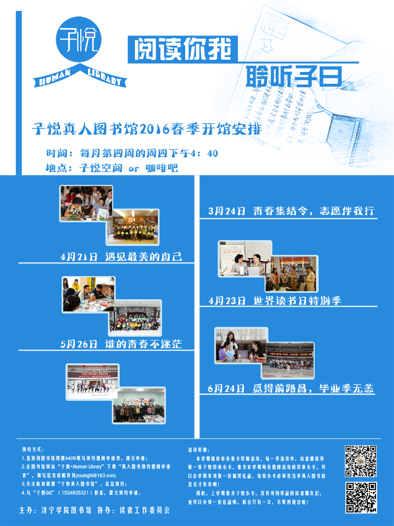 一个浩浩冬日的寂冷,最终换来了春天的温暖。二三月交,日光渐长,我们又开始了新学期的的征程,在这个北葵向暖的节度里,子悦在新一年中又将和大家见面了。这个学期,将沿袭每月一次的传统,共四次,每月第四周的周四下午在我们图书馆子悦空间(A411),又间或有其他惊喜的意外,我会随时告诉您。