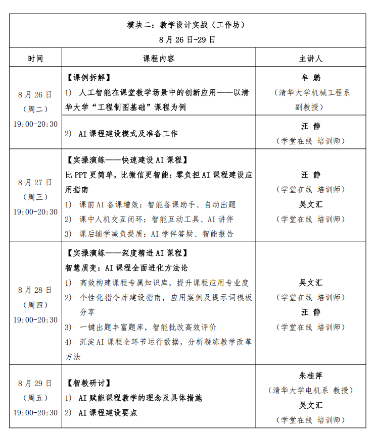 模块二:教学设计实战(工作坊),8月26日-8月29日,每晚19:00-20:30;