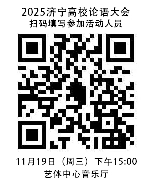 2025济宁高校论语大会于11月19日(周三)下午15:00在我校艺体中心音乐厅举行,邀请各部门负责人、各二级学院党委书记、院长现场观看。请各部门单位11月17日(周一)下午16:00前扫码填写参会人员,以便安排座区。