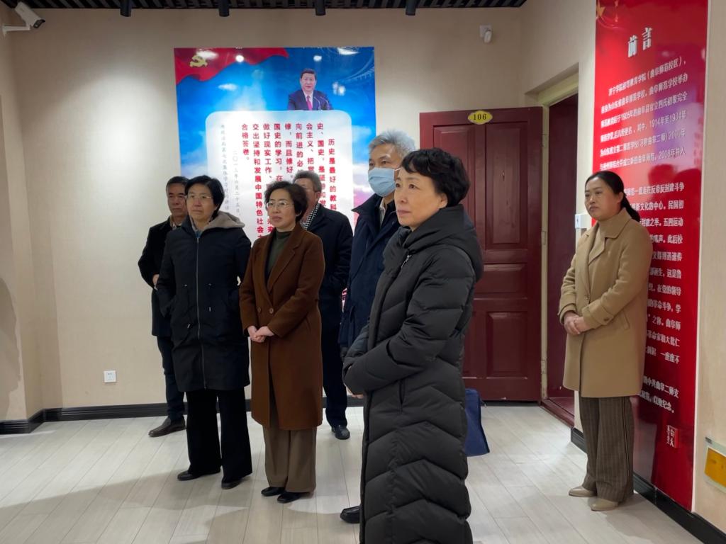 揭牌之前,曹金萍主任一行四人和济宁市委常委、秘书长董波,曲阜市委书记李丽及济宁市、曲阜市统战部门有关领导,在学校领导和有关同志陪同下,到初等教育学院(原曲阜师范学校),实地考察了万里题词碑、小礼堂、万里图书馆、工字楼、考棚、校史馆及中共山东省立二师支部纪念馆等地。他们对初等教育学院丰厚的儒家文化和红色文化资源给予了充分肯定和认可。