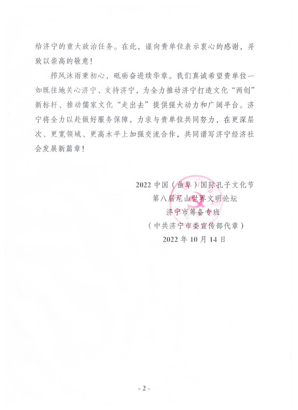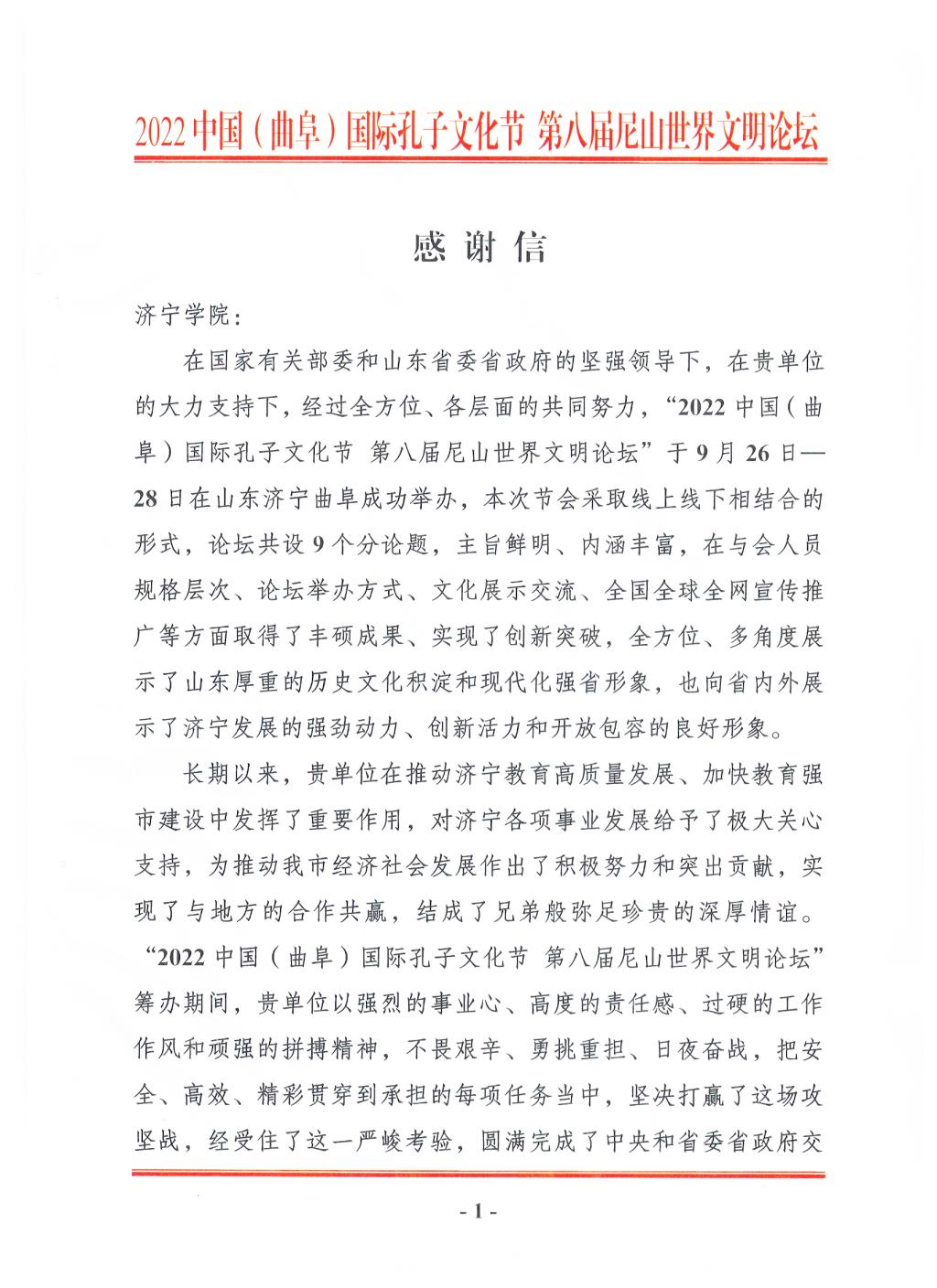 近日,2022中国(曲阜)国际孔子文化节 第八届尼山世界文明论坛向我校发来感谢信,感谢学校对2022中国(曲阜)国际孔子文化节第八届尼山世界文明论坛给予的大力支持和鼎力相助。