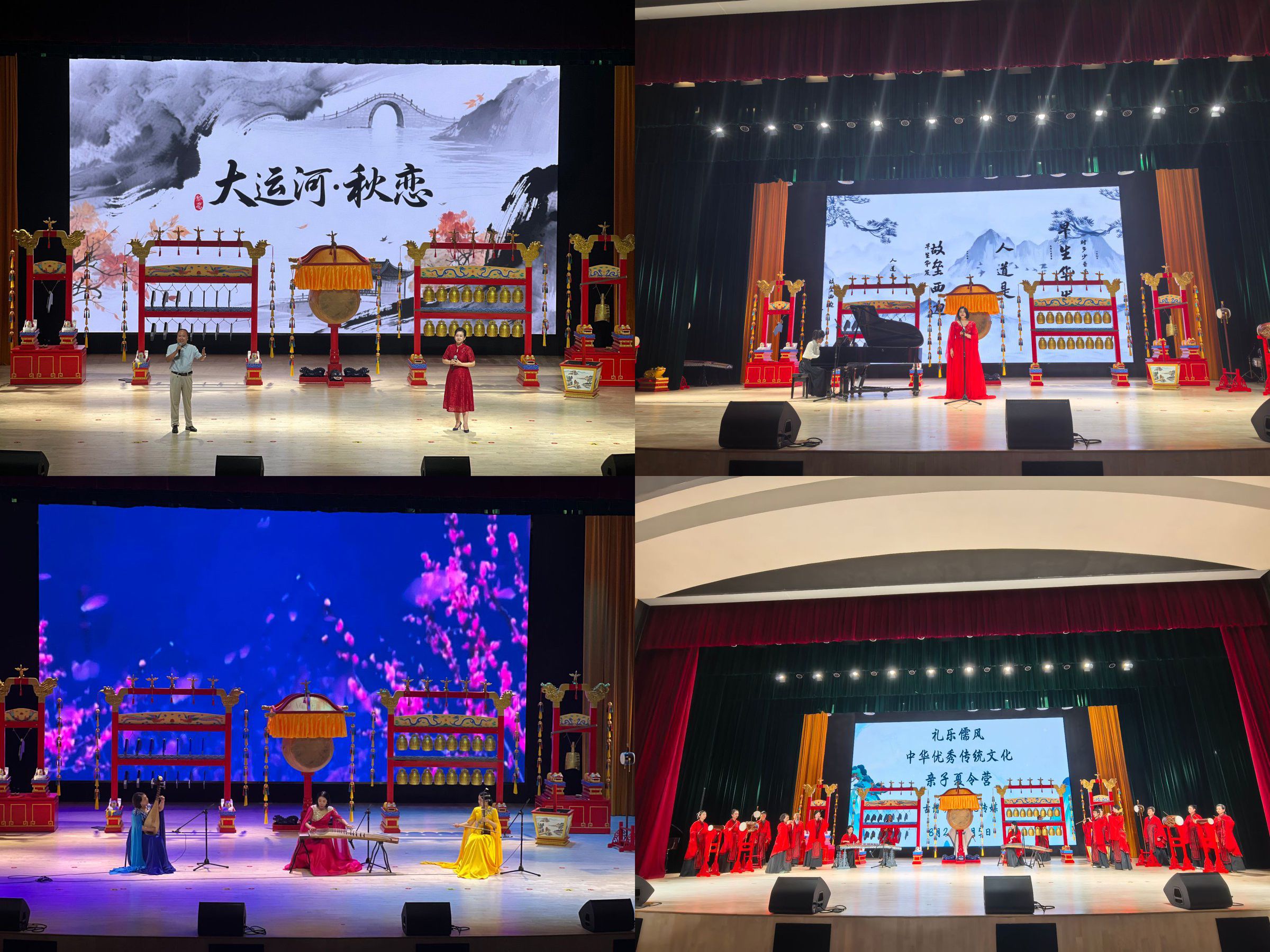 郝晓虹、邹波、蒋亚丽老师的民乐三重奏《春江花月夜》以乐器交织重现张若虚笔下“春、江、花、月、夜” 的空明意境;齐江与靳晓航老师的朗诵则以诗勾勒京杭大运河的历史纵深,触摸文明载体的厚重底蕴。