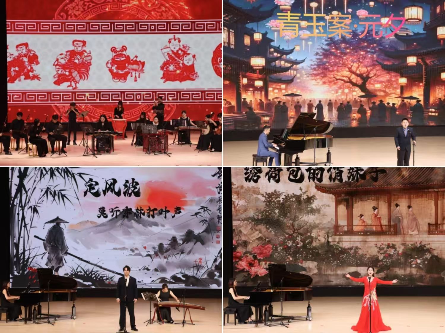传统新声,古韵流淌民乐团“竹韵丝竹坊” 以经典曲目《金蛇狂舞》拉开帷幕,激昂旋律瞬间点燃现场,勾勒出传统民乐的热闹欢腾;独唱《青玉案・元夕》《定风波・莫听穿林打叶声》《秀荷包的俏妹子》,歌手以细腻声线,让古典诗词与当代声乐碰撞,重现千年词意的深邃韵味 。