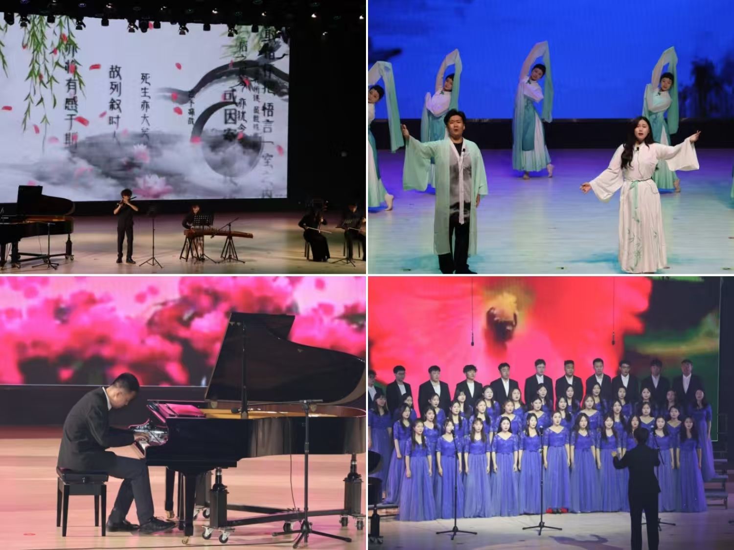 本场音乐会凝聚了全体同学数月的心血,一系列精心编排的节目跨越古今,展现了深厚的专业技能与多元艺术探索。音乐会以饱含深情地合唱《奉献》拉开序幕,唱响对家国与师友的诚挚礼赞。陕北风情钢琴独奏《山丹丹开花红艳艳》以现代技法点燃红色记忆,尽显民族艺术的鲜活魅力;古韵新声在《临江仙·樱桃落尽春归去》中流淌,李煜的千年词意与当代声乐深情对话;器乐合奏《兰亭序》则以丝竹管弦重现魏晋风骨,让凝固千年的书法神韵在旋律中翩然“复活”。歌曲《故乡》寄托游子乡愁,唱跳《世界赠与我》洋溢着青春活力,《直到世界尽头》则彰显了学子们昂扬追梦的坚定信念。最后,音乐会在全体同学深情演绎的经典合唱《友谊地久天长》中圆满落幕。