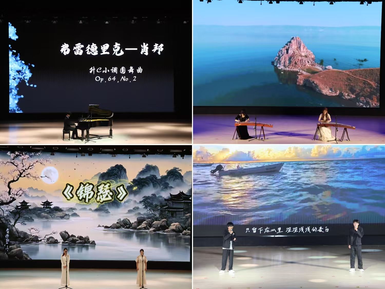 展演在钢琴独奏《肖邦升c小调第七号圆舞曲,作品64之2》中拉开序幕,尚轩嘉以细腻的触键将肖邦的浪漫与哲思娓娓道来。随后,康新茹、王馨的古筝双重奏《战台风》震撼全场,磅礴的音色与激昂的节奏生动再现了工人与台风搏斗的壮阔场景,赢得阵阵掌声。张雅璐、赵梓含演绎的歌曲《锦瑟》以现代旋律诠释李商隐的千年诗韵,令人耳目一新;刘智升、刘烨隆则以《蓝莲花》唱响对自由与信仰的追寻,质朴的歌声直击人心。房敏的独唱《七月的草原》搭配赵浩然的钢琴伴奏,将草原的辽阔与牧歌的悠扬完美融合,勾勒出一幅壮美画卷。