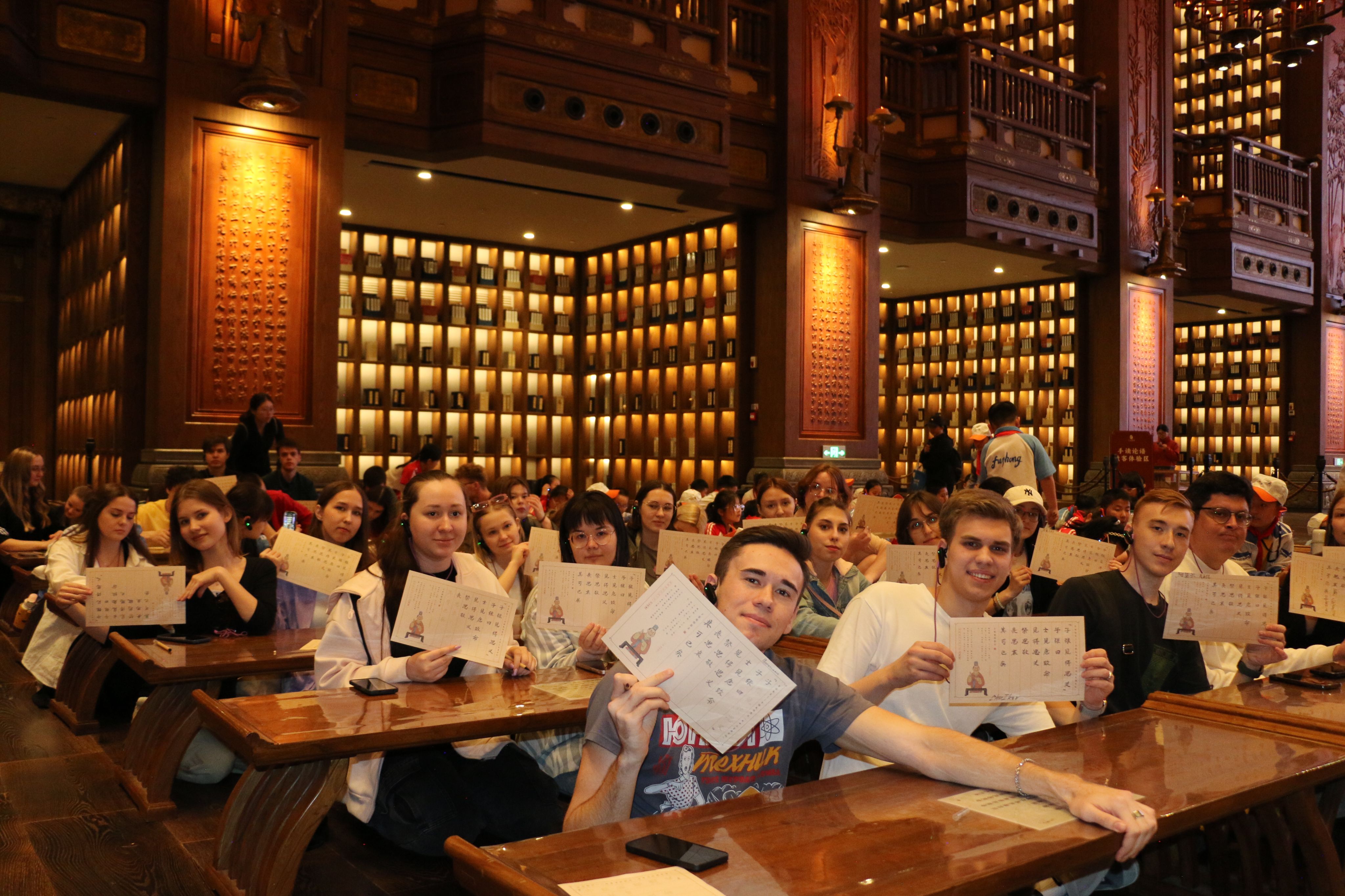 在72米高的孔子像前,留学生们合影留念,感悟“至圣先师”跨越千年的智慧光辉。活动中,学生们在专业导学团队指导下,手握毛笔体验“手读《论语》”,一笔一画临摹“有朋自远方来,不亦乐乎”等经典语句。来自俄罗斯的安柠感叹:“汉字书写让我触摸到中华文明的肌理,每一笔都是与历史的对话。”随后,学生们观看了以《论语》为主题的互动动画短片,通过生动影像理解“仁者爱人”“克己复礼”的核心理念。