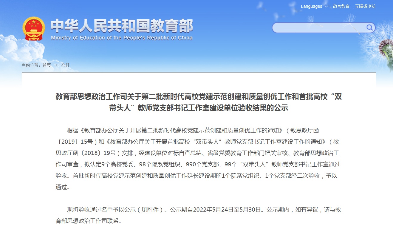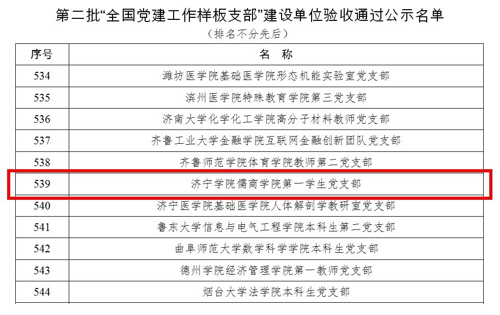 5月24日至5月30日,教育部对第二批新时代高校党建示范创建和质量创优工作验收通过名单进行了为期一周的公示。经建设单位对标自查总结、省级党委教育工作部门把关审核、教育部思想政治工作司审查,我校儒商学院第一学生党支部顺利通过第二批“全国党建工作样板支部”示范创建验收。