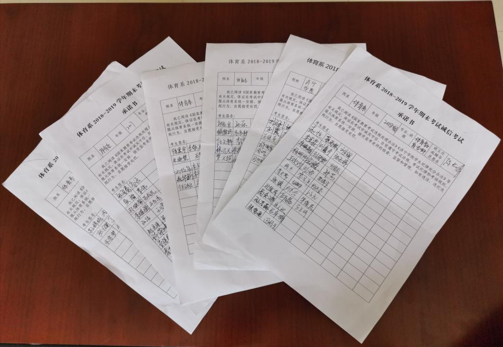 体育系历来重视考风学风建设。本学期末,体育系相继开展了诚信考试专题座谈会、诚信考试宣誓仪式、签署诚信考试承诺书等活动,增强学生积极备考的意识,强化诚信考试的概念,为加强考风建设、严肃考纪、营造良好的考试环境打下了坚实基础。