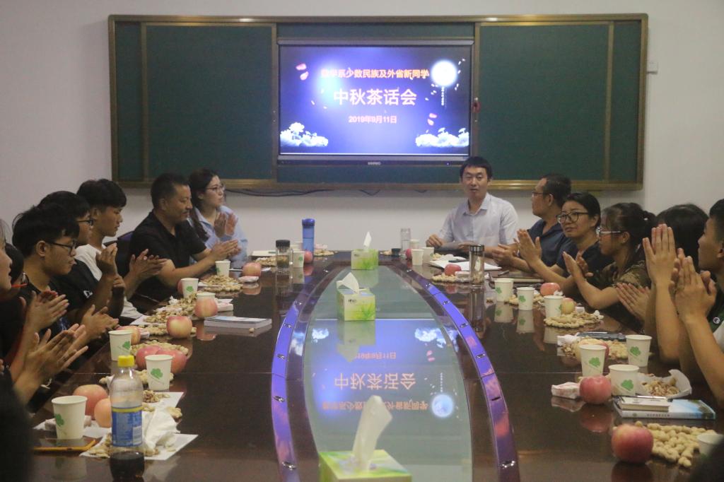 9月11日晚,数学系在系会议室举办外省籍及少数民族新生中秋茶话会。系党总支书记来维龙、主任王绍锋、党总支副书记韩西莲以及新生辅导员陈轶洋与学生欢聚一堂,亲切交流。茶话会由团总支书记冯秉政主持。