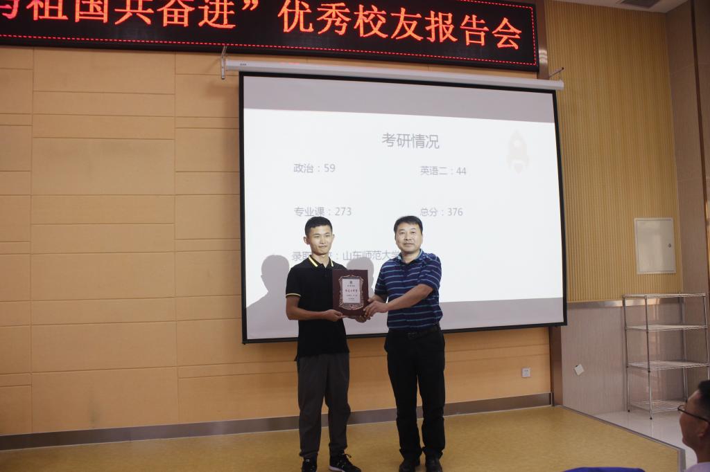 9月23日,我校体育系校友、山东师范大学体育硕士李阳做客校友大讲堂,在2号楼B101室作了“我与祖国共奋进”考研经验交流专题报告。体育系党总支书记辛亚杰、副书记陈长峰、团总支和辅导员及学生代表200余人参加了本次报告会。辛亚杰为李阳颁发了“校友大讲堂”纪念铭牌。