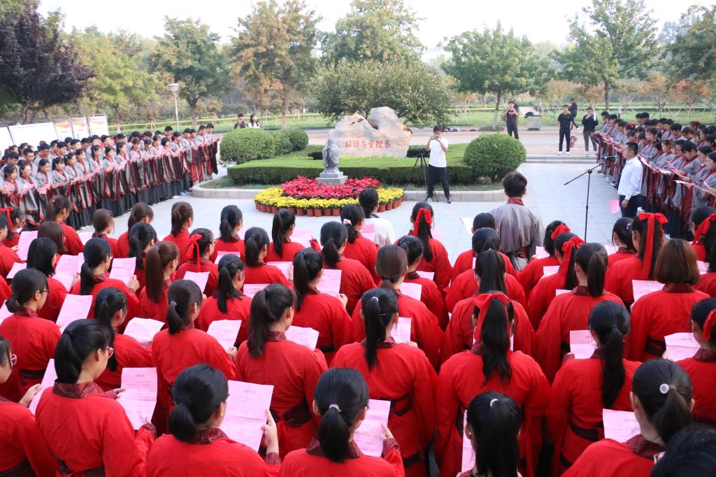 祭拜仪式上,陆波发表致辞,表达了对先贤孔子的尊敬、怀念之情。全场肃立,身着礼仪汉服的全体师生向大成至圣先师孔子行三鞠躬礼:一鞠躬,敬至圣先师孔子,传华夏千古绝学;二鞠躬,敬历代先贤先烈,开中华万世太平;三鞠躬,敬高德博学师长,立鸿鹄大志人生。随后,齐慧丽宣读祭文,缅怀先师。“ 泱泱华夏,郁郁儒风。周公封鲁,人文传承。大哉邹鲁,璀璨奎星。先师孔子,至圣大成…… ”,祭文在赞颂大成至圣先师孔子的同时,发出了仰望先哲,塑造人格的号召,令现场师生备受鼓舞。最后,仪式在全场学子齐声诵读《论语》的铿锵声音中圆满结束。整个典礼肃穆祥和、磅礴大气,让师生接受了一场生动的传统文化教育。