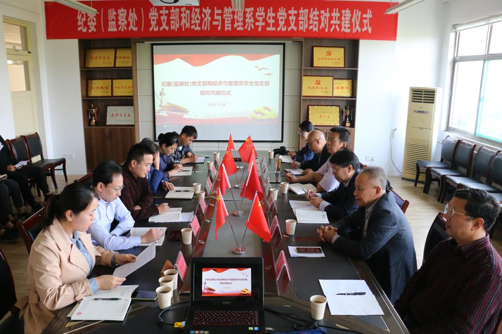 为深入推进“不忘初心、牢记使命”主题教育,加强基层党组织建设,10月8日下午,纪委(监察处)党支部和经济与管理系学生党支部启动结对共建活动。纪委副书记、监察处处长吕祥华主持共建启动仪式,纪委副书记李传伟、党群部门党总支书记郭怀伟、经济与管理系党总支书记陆波及党总支委员,以及双方支部党员参加活动。