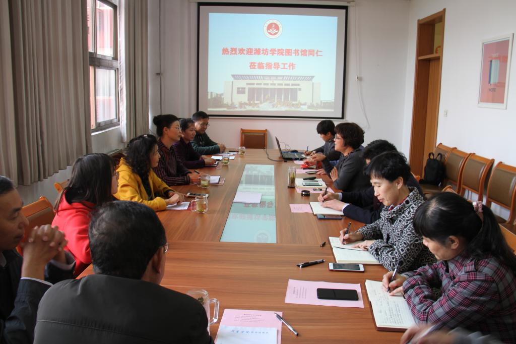 11月12日上午,潍坊学院图书馆副馆长蔡兰荣一行4人来我校图书馆进行参观考察,主客双方在图书馆三楼研读室进行了座谈交流。