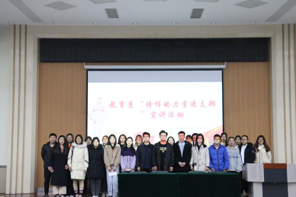 11月20日晚,由共青团亚星在线登录官网委员会主办,教育系团总支承办的“榜样的力量”大学生成长成才宣讲会在3号楼报告厅举行,教育系学生会代表以及2019级新生代表参加了宣讲会。