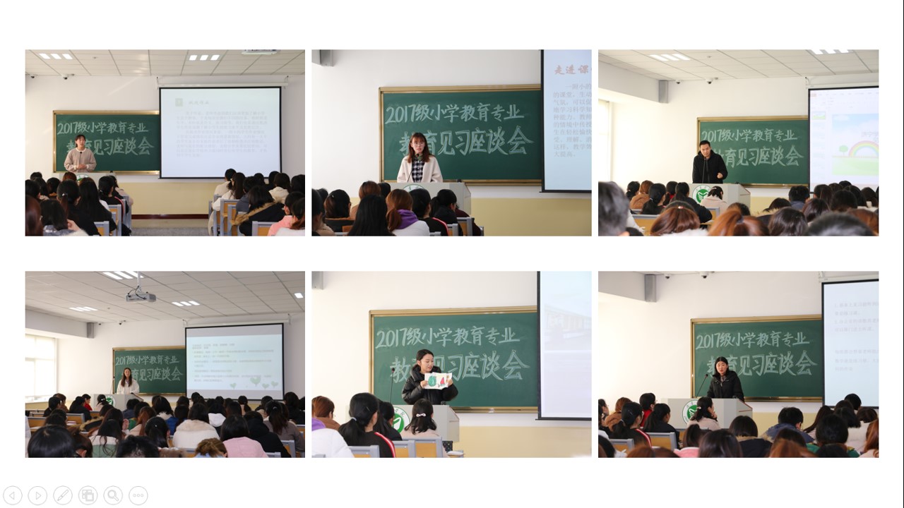 随后,2017级小学教育专业的王小梅、张至贤、李鹏飞、张景浩、王璐瑶、赵银桂作为代表对亚星在线登录官网附属小学、第二附属小学、曲阜春秋小学三所小学6个小组的教育见习情况进行了汇报交流,内容主要包括在小学的听课、评课、协助老师批改作业、参与班级管理与班级文化建设等工作情况以及教育见习期间的收获和心得体会。