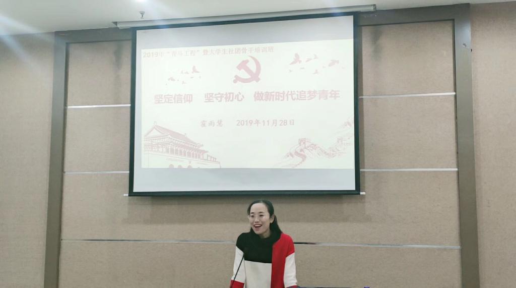 11月28日晚,“青马工程”暨2019年大学生社团骨干培训班系列讲座在图书馆一楼会议室召开。我校科研处副处长霍雨慧博士应校团委邀请,为培训班学员作了题为《坚定信仰 坚守初心 做新时代追梦青年》的讲座。校团委相关负责人出席并主持讲座。