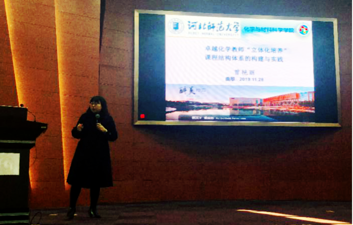 曾艳丽教授作了题为《卓越化学教师“立体化培养”课程结构体系的构筑与实践》的主旨报告,她结合师范专业认证的标准要求分析了化学教师培养过程中的课程体系建设,并分享了师范专业认证过程的经验和体会。