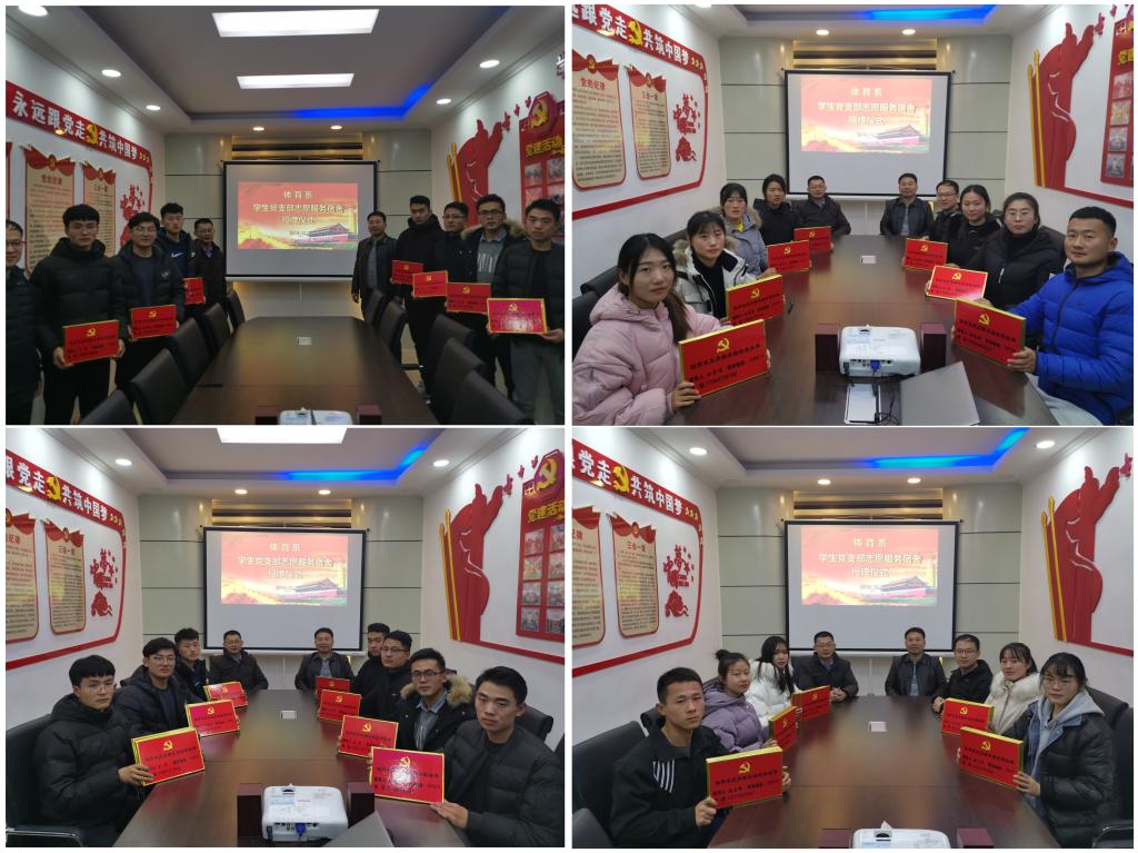 辛亚杰在授牌仪式上强调,开展党员志愿服务宿舍活动,是认真贯彻落实“不忘初心、牢记使命”主题教育支部党员志愿服务的一项重要内容,也是创新支部党员志愿服务形式的一项重要举措,通过党员一对一,一对多联系非党员宿舍,明确志愿服务目标与任务,密切学生党员与群众的联系,增强学生党员的服务与责任意识,切实发挥好支部的战斗堡垒作用和党员的模范带头作用,用实际行动为创建安全、整洁的宿舍环境做出应有的贡献。仪式上,支部纪检委员武强宣读了体育系学生党支部党员志愿服务宿舍活动方案和党员联系宿舍分配表。授牌仪式后,进行了支部预备党员转正和新发展预备党员宣誓活动。
