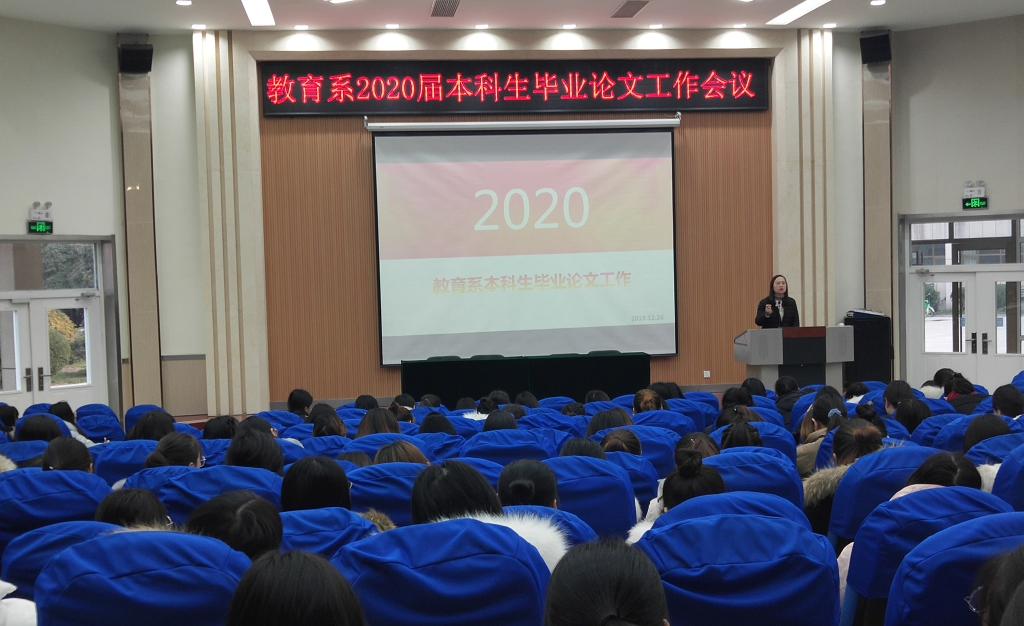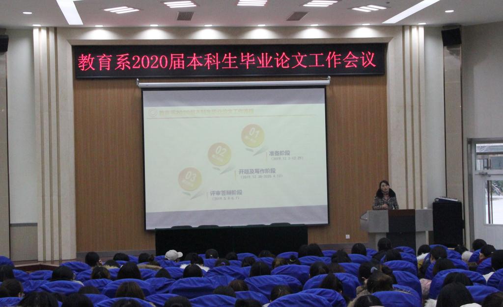 毕业论文是确保本科教学质量的关键环节,为有效高质开展2020届本科生毕业论文工作,12月26日下午,教育系在3号楼报告厅召开2020届本科生毕业论文工作会议,教育系副主任贾英侠、科研秘书林艳艳及2020届312名本科毕业生参加会议。