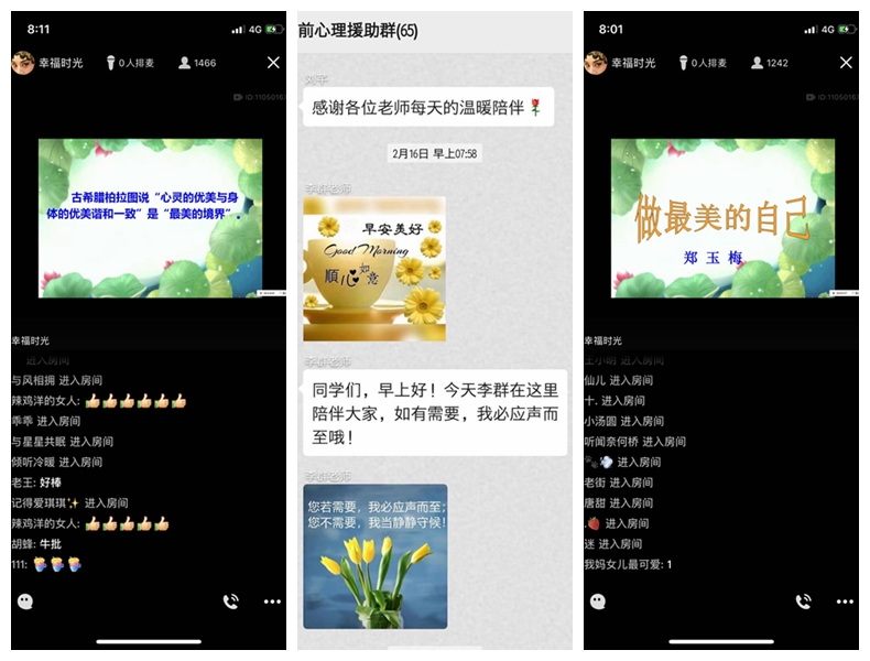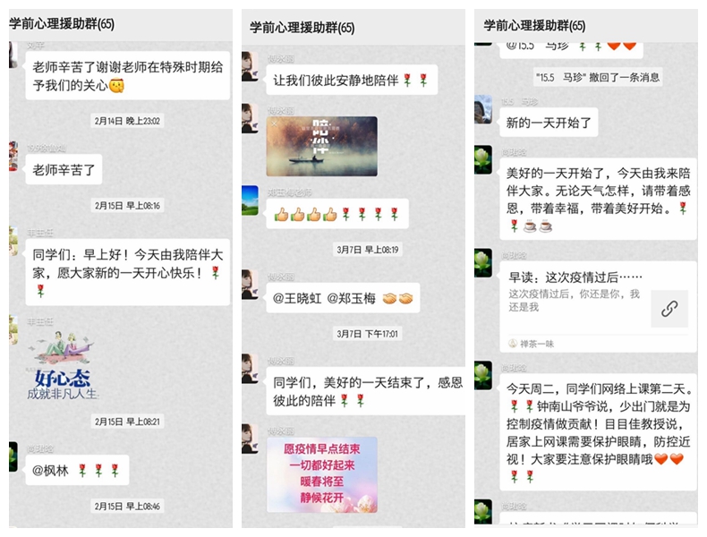 一个多月的守望相助,让学前教育学院心理工作坊的老师们,成了同学们的贴心人。一句句温馨问候,一个个暖心答疑,让同学们学会了如何安抚情绪,如何关爱自己,如何用爱的眼光去看待身边的人和事。