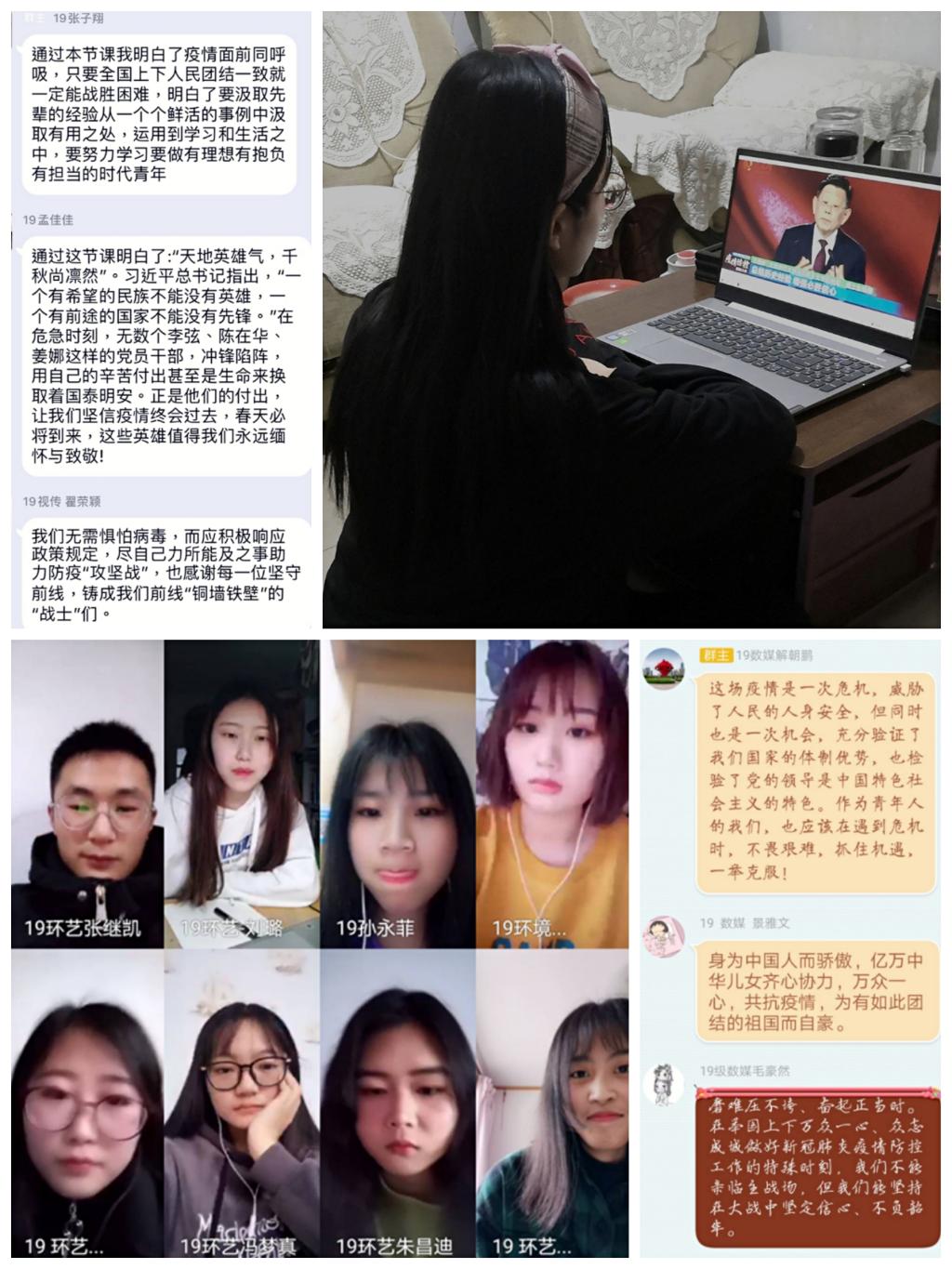 构筑“线上”沟通机制,开展日常管理工作。抓实学习管理,组织辅导员、班主任开展线上考勤工作,确保学生网络课堂不掉线,定期推送名校课程资源、精品书籍、经典影片,提高学习质量;紧跟日常事务管理,定期召开线上班会,组织学习“疫情防控手册”,收看“全国大学生同上一堂疫情防控思政大课”等主题节目,并跟进主题讨论、撰写心得体会;心理疏导不掉线,开通心理疏导专线,宣传疫情主题心理健康知识,召开主题班会,掌握学生思想动态,精准施策。确保疫情防控期间思想政治教育不缺位,日常管理不缺失。