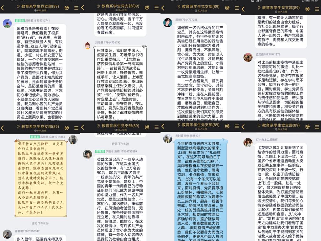 4月2日晚,教育系学生党支部利用QQ群课堂开展了以“居家学习、同心抗‘疫’”为主题的线上主题党日活动,活动由支部书记杜鹃主持,学生党支部全体党员参加。
