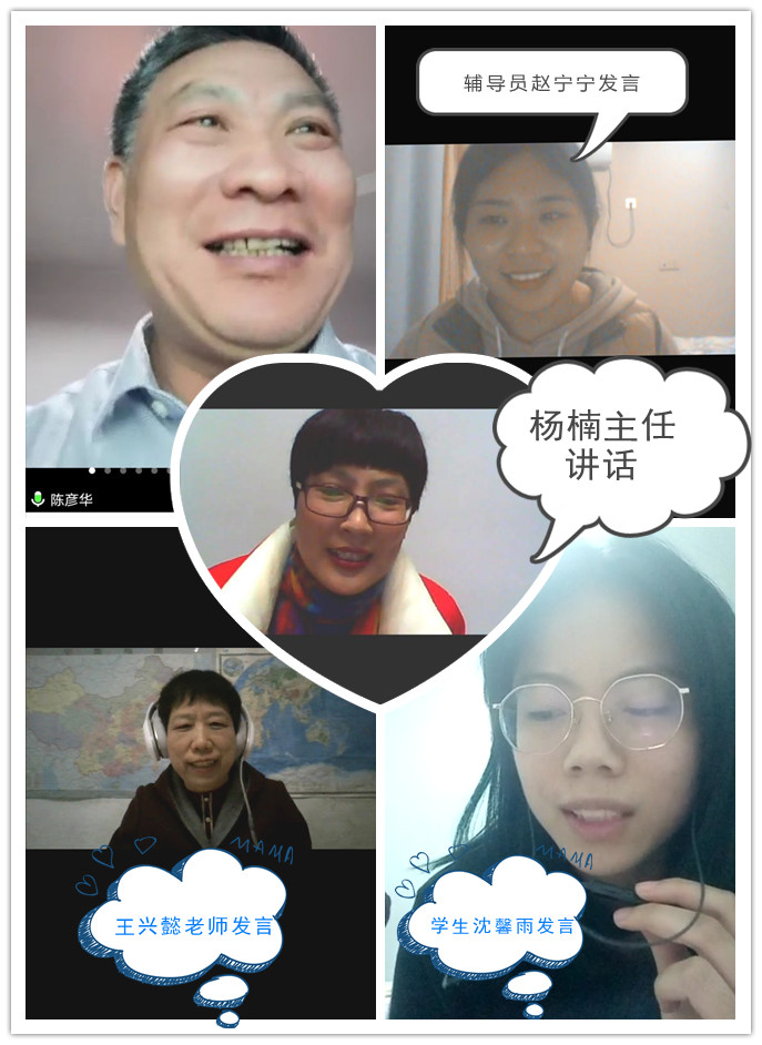 最后,杨楠总结中指出,千言万语汇成六个字:感恩、感谢和感动。感恩我们伟大的祖国让我们身处疫情能够平安健康、衣食无忧,感恩祖国科学技术的强大让我们能借助各种网络平台实现顺畅高效的线上教育教学;感谢无私奉献的医护工作者和社区工作者,让我们看到了担当、责任和榜样的力量;感动我们老师为了学生们熬夜加班精雕细琢保证网上直播课程质量和教学效果的热情与敬业,感动我们学生们踏实认真、积极乐观、求是求新的学习精神。有了这种精神,面对疫情和困难,我们再也不怕了,打不倒我们的灾难必将让我们变得更坚强,让我们在感恩、感谢、感动中不忘初心,砥砺前行!