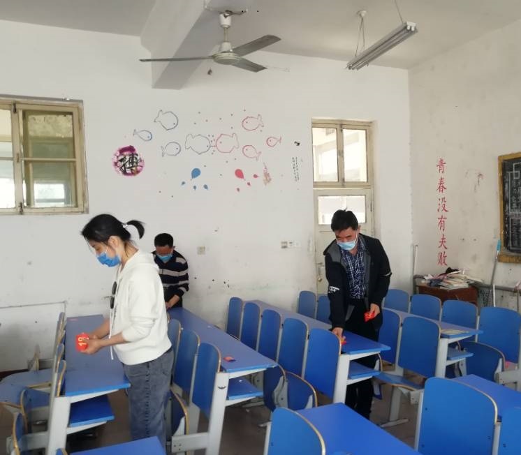 本次主题活动与开学防疫准备工作紧密结合。根据上级有关要求,学生返校后上课必须保持安全距离,学生党支部提前准备,将第一批返校班级进行拆解,每间教室不超过30人。为做到座位固定,不随便乱坐,按学号制作了每位学生的座签和教室门口标识 。主题活动分党小组进行,三个党小组按要求分别张贴了16口教室的门口标识和学生座签,以实际行动争做复学防疫先锋,为学生返校后的防疫工作做好准备。