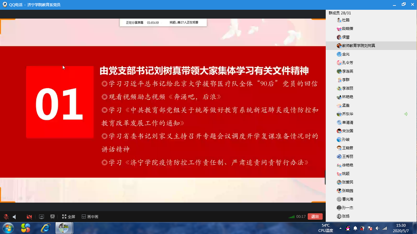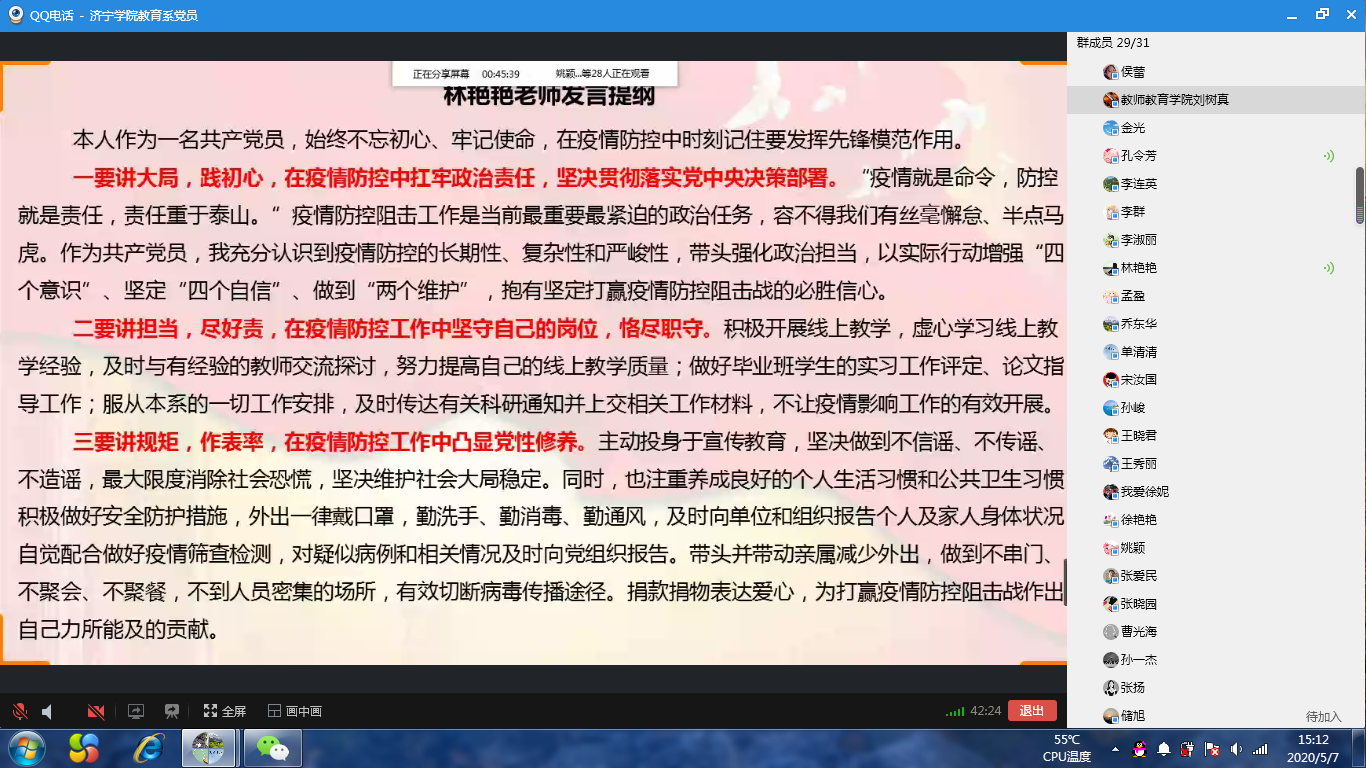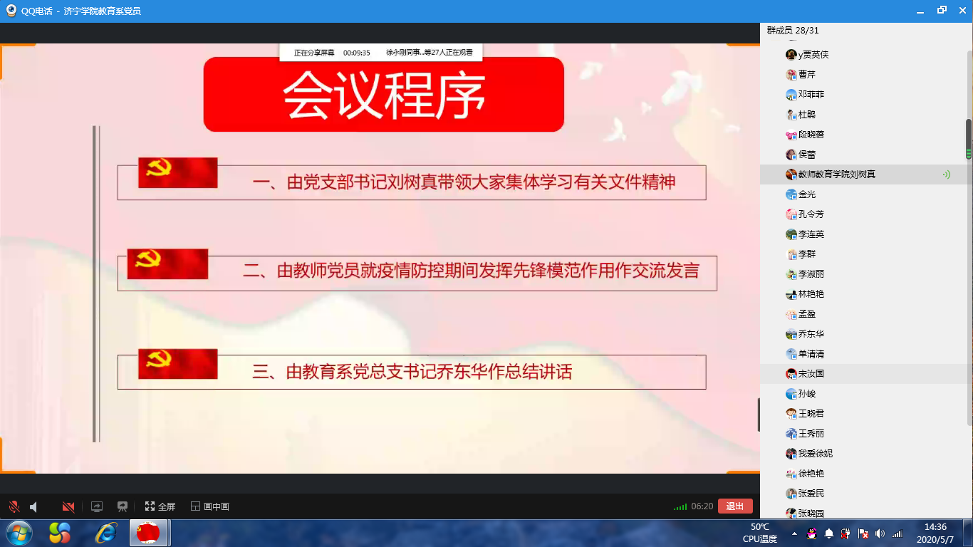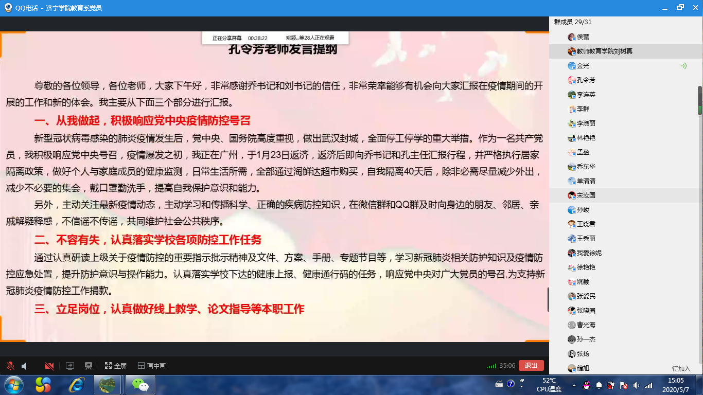 为深入贯彻落实习近平总书记关于疫情防控工作重要指示批示精神,充分调动广大党员的担当意识和工作热情,切实做好学生春季学期开学返校的各项准备工作,5月7日下午,教育系教工党支部组织全体党员通过QQ屏幕分享的形式,开展“发挥模范作用,强化担当意识,提高工作成效”线上主题党日活动。活动由教工党支部书记刘树真主持。