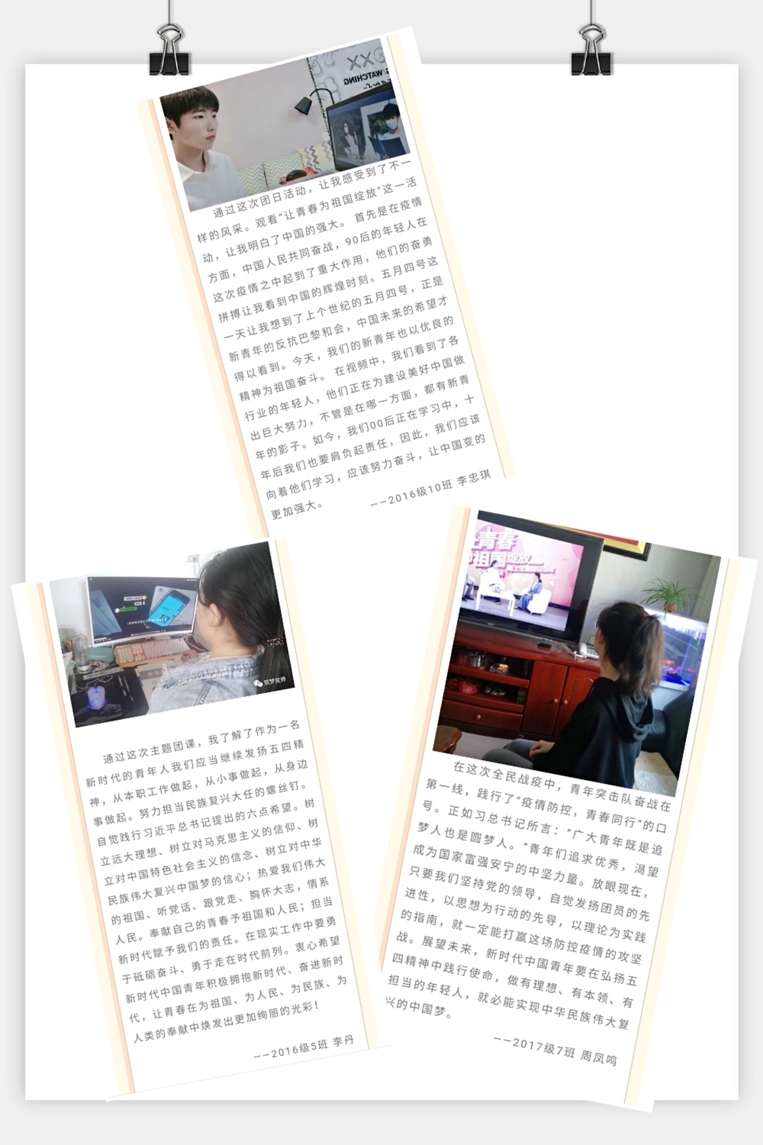 网上主题团日活动在校区广大团员青年中引起热烈反响,同学们纷纷表示要适应时代发展的需求,练就过硬本领,把爱国之志变成报国之行。用一颗赤子之心,用一腔爱国热情,不惧风雨,勇挑重担,把理想抱负熔铸在脚踏实地的奋斗中,在党和人民最需要的地方绽放青春之花。