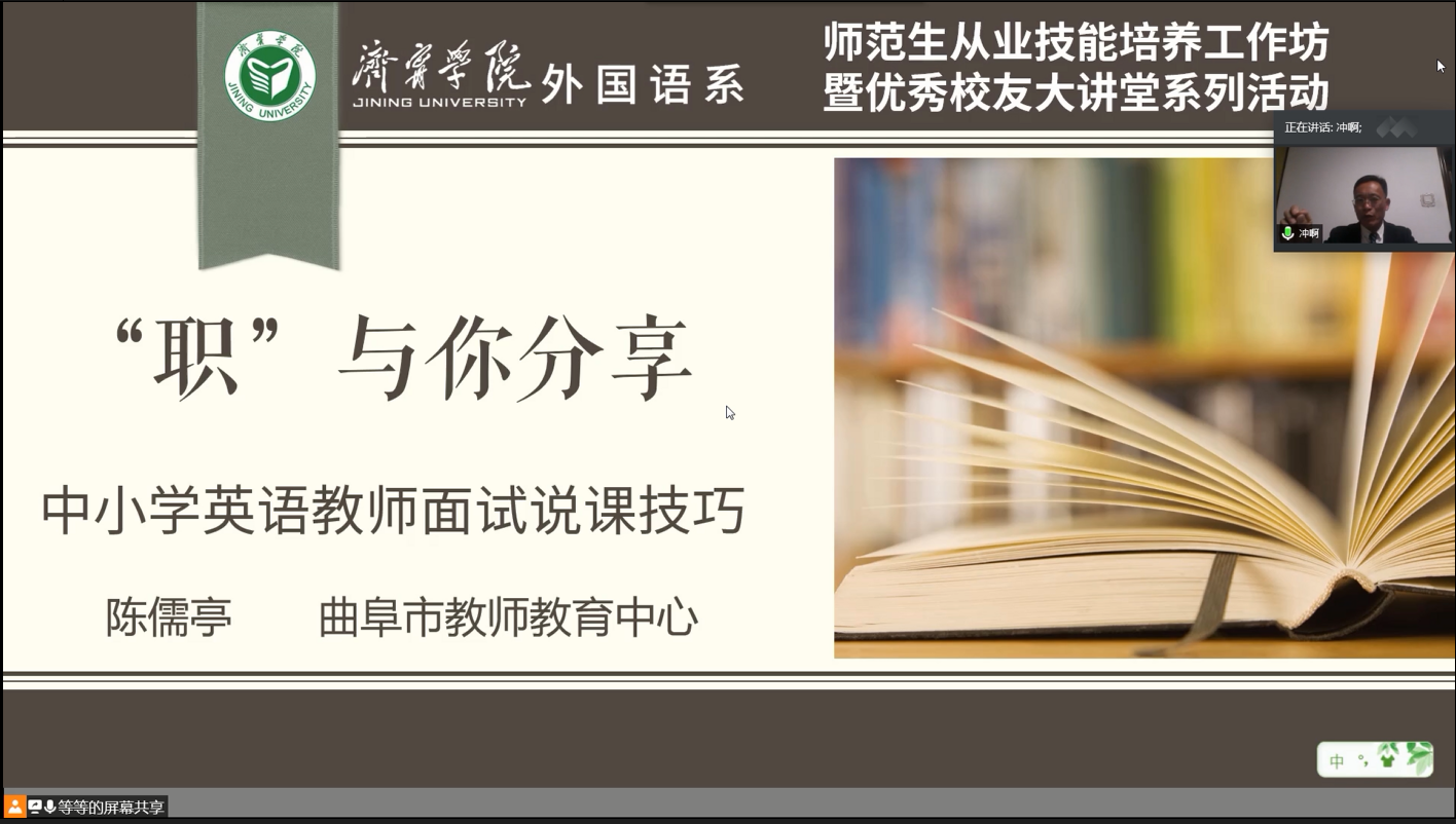 为了全面培养和进一步提升外国语系师范生的教育情怀、学科素养、教学能力和职业发展能力,5月12日晚6:30-9:00,我系通过腾讯会议启动师范生从业技能培养工作坊暨优秀校友大讲堂系列活动。本次工作坊邀请了我系95级校友陈儒亭为我们做了“‘职’与你分享——中小学英语教师面试说课技巧”主题报告。外国语系教师和200多名师范生共同参加了此次活动。工作坊报告会由外国语系副主任张颖主持。主任杨楠致开幕词并总结发言。