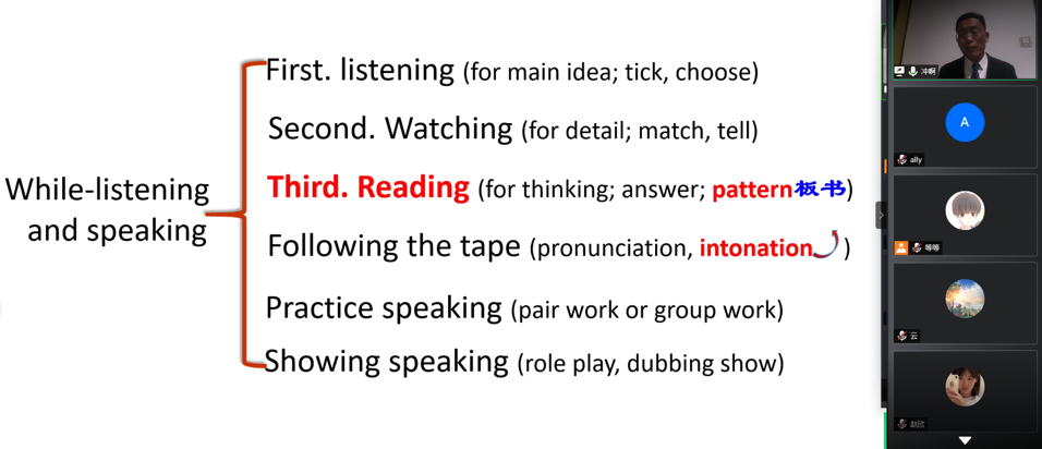 工作坊主讲专家陈儒亭从课程标准、核心素养、语音素质、常见课型、教学技能、组织原则和几点提醒等七个方面进行展开,其中主要对常见课型和教学技能进行详细地解析,从阅读课和听说课的课堂环节设计来分享设计方法和处理技巧,并辅以优秀课例说明;对教学技能中的说唱要求进行现场展示,方法灵活,深入浅出,生动精彩。最后的线上互动讨论话题多样,陈儒亭对学生们提出的问题做了耐心细致的解答,并再次表达了对母校和老师们的感恩和感谢。同学们表示此次活动加深了他们对教学理念、教学规律和教学实践的认识,激发了内心深处对教育的热爱,同时增加了参加教师资格证考试和就业应聘的自信心。
